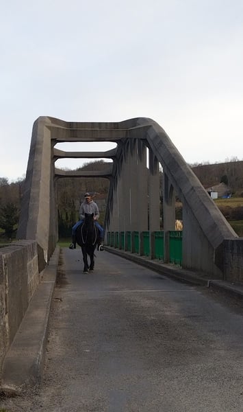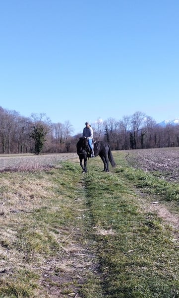 Jument pleine de promesses qui progresse rapidement en carrière comme en exterieur. Belle encolure et belles allures dont un pas franc en balade. Debourrée dans la confiance. Apprentissage de l'équilibre, du respect mutuel et de la légèreté. Equilibre spontané intéressant, bonne montée de garrot et bonne impulsion. Autonome en exterieur, pied sûr, à l'aise dans l'environnement J'inclus un accompagnement professionnel pour assurer la transmission des codes et/ou apporter la formation suffisante au nouveau propriétaire. Elle a grandi en montagne en troupeau. A jour des soins courants, dentiste, ostéo, parage, vermifuge. Pieds nus
