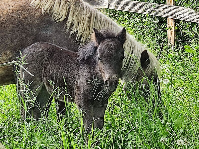 Dit is ons merrieveulen Weinberg's Lillyfee. Ze is geboren op 4 april 2025. Ze krijgt papieren van het ZfdP. Ook Lillyfee kon de fokkeuringsrechter van zich overtuigen en kreeg de veulenpremie. Vader is onze hengst Turmalin vom Buchberg Isabell Buckskin, met een schofthoogte van 80 cm. Hij is voorlopig op ons verzoek in hengstenboek 2 ingeschreven. Volgend jaar zullen we hem voorstellen voor de keuring. Moeder is onze Laura, 78 cm en zij is bruin. Lillyfee lijkt een Smoky Black te zijn. Dit kan de nieuwe eigenaar laten testen. Ook groeit zij op in een kudde. Lillyfee mag per direct haar koffertje pakken. Lillyfee kan graag bezocht worden voor een persoonlijke kennismaking. Bij interesse kunt u gerust contact opnemen voor meer informatie.