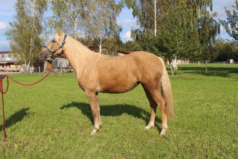 Verkaufe elegante Missouri Fox Trotter Stute – Palomino, geb. 2020 Diese wunderschöne Missouri Fox Trotter Stute besticht durch ihre anmutige Erscheinung und ihr angenehmes Wesen. Geboren im Jahr 2020, ist sie bereits gut ausgebildet und zeigt einen ausgeprägten Gang, der für ihre Rasse typisch ist. Mit einem Stockmaß von 150 cm ist sie ideal für Reiterinnen und Reiter, die ein zuverlässiges und charakterstarkes Pferd suchen. Sie ist freundlich im Umgang, lernwillig und eignet sich sowohl für Freizeitritte als auch für ambitionierte Turnierreiter. Das elegante Palomino-Fell macht sie zu einem echten Blickfang auf jedem Turnier und bei jedem Ausritt. Bei Interesse oder weiteren Fragen stehe ich gerne zur Verfügung. Vereinbaren Sie gerne einen Termin für eine Besichtigung und eine Proberunde! Weitere Verkaufspferde auf Anfrage.