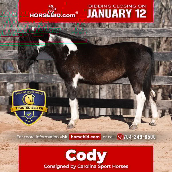 ♦️𝐍𝐄𝐖 𝐘𝐄𝐀𝐑'𝐒 𝑬𝒙𝒕𝒓𝒂𝒗𝒂𝒈𝒂𝒏𝒛𝒂♦️ Happening now thru MONDAY | JANUARY 12th - Available EXCLUSIVELY on HorseBid's website! For more details and to register visit: www.Horsebid.com CONSIGNOR CONTACT: Carolina Sport Horses 704-249-8500 LOCATION: Clover, SC BREED: Pony REGISTERED: No REGISTERED NAME: Cody COLOR: Black White Paint HEIGHT: 11 AGE: 10 GENDER: Gelding Cody is the kind of pony every family hopes to find — safe, steady, and genuinely happy taking care of his rider. He is quiet and confidence-giving under saddle, making him an excellent choice for children and families looking for a trustworthy, uncomplicated partner. Cody has a patient nature and offers the type of ride that allows kids to relax, learn, and enjoy their time in the saddle. One of Cody’s best qualities is his personality. He truly loves kids and attention and thrives in a family environment where he can be doted on and included. He is affectionate, kind, and enjoys being groomed, handled, and loved on, making him a barn favorite. Cody is easy to handle on the ground with excellent manners and is simple to tack, groom, and manage. He is well suited for arena riding, light trails, lessons, and all-around family enjoyment. Proudly offered by Carolina Sport Horses, Cody represents the quality, honesty, and emphasis on safety our program is known for. He is the type of pony we confidently place with families seeking a dependable, loving, and confidence-building partner. *All of our descriptions are OUR OPINION and ARE NOT FACTS. They represent how the horse responded and behaved while in our care. Horses can change at any time as they are living, breathing animals. There are no warranties expressed or implied via the descriptions above*PLEASE READ OUR BUYERS GUIDE PRIOR TO BUYING OR BIDDING ON ANY HORSE WE HAVE AVAILABLE. Interested in bringing Xerox home? Give us a call today! Please take the time to read our Buyers Guide to answer any questions or concerns you may have. Contact Us Call or TEXT 704.249.8500