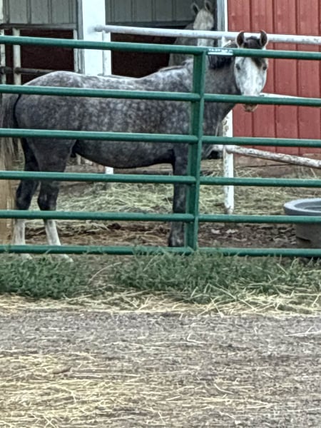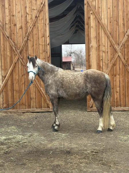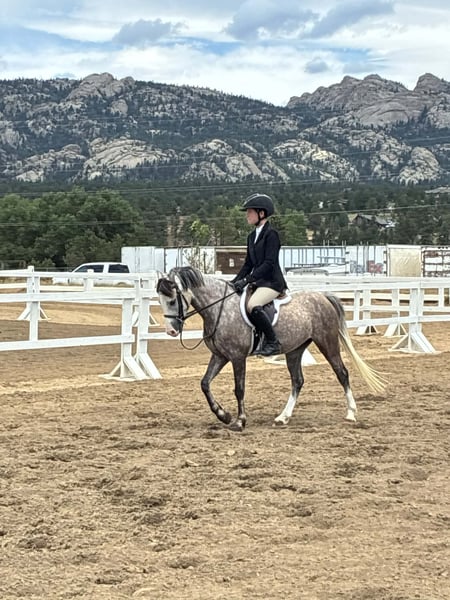 "AVAILABLE ON ONLINE HORSE AUCTION AT www DOT PlatinumEquineAuction DOT com BIDDING OPEN NOW thru SUNDAY | APRIL 19TH! *Final price will be determined on auction site* CONSIGNOR CONTACT INFO: Thea Park 970-632-3644 LOCATION: Fort Collins, CO ★★ SHOTGLASS BLUESTONE ★★ “Romeo” | 2021 Registered Welsh Pony Gelding | 12.2 Hands | Fancy • Fun • Kid-Approved Romeo is the definition of a dream pony. This 2021 registered Welsh gelding stands 12.2 hands tall and is as adorable as they come, with a perfect button nose, beautiful face, striking eye, and correct conformation to match. He’s the kind of pony that captures hearts the moment he walks out of the stall. Romeo is first to meet you at the gate and absolutely loves attention. With his goofy personality and sweet nature, he quickly becomes a favorite wherever he goes. He bonds easily with his people and has the kind of temperament that makes him a joy to have in the barn. Under saddle, Romeo is well-started and confidently progressing. He completed 90 days of jump training last summer and has been ridden and shown by lesson riders. He has a solid walk, trot, canter, and stop, a natural lead change, and transitions easily — cantering off a kiss and stopping off voice cues. He’s responsive, balanced, and incredibly fun to ride. He is reliable enough that my 2 year old daughter with very little riding experience can ride him around all by herself. Romeo has been shown at Estes Park and Copper Penny, hauling in, stepping off the trailer, and riding exactly the same as he does at home. His consistency and level-headed nature make him stand out in new environments. He also absolutely loves the trail. Romeo has been ridden extensively outside, confidently navigating dogs, bikes, running teams, strollers, traffic, and even busy downtown settings at night with music and crowds. He crosses water, bridges, tunnels, and will ride along the road without hesitation. Beyond riding, Romeo has a strong groundwork foundation and has been introduced to liberty work. He’s learning tricks like the step-up, bow, and lay down, and enjoys engaging with his handler. He’s also been ridden bareback and with a neck rope, has a finished neck rein, and moves nicely off leg cues. Romeo combines talent, brains, heart, and personality into one compact, eye-catching package. He has a wonderful foundation, a big try, and the kind of disposition that makes him truly special. If you’re looking for a fancy, safe, and versatile pony with show experience and real-world miles, Romeo is ready to be someone’s absolute favorite. Watch his extremely detailed video and come meet this standout little gelding in person — he’s every bit as cool as he sounds. For more information, contact Thea at 970-632-3644.
