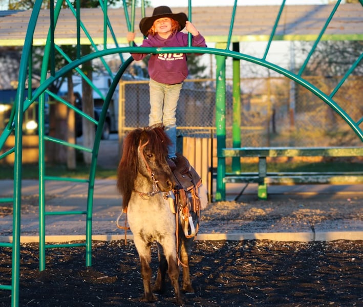 Meet Blueberry—Aka Berry, buckle up, because this pony comes with a resume and zero bad pony habits! Blueberry is a true old soul in a young body—at just 7 years old, he rides like a seasoned veteran. With miles under his belt and a kind, willing attitude, he takes care of his little rider and does everything asked with ease and heart.