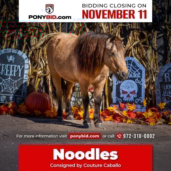 𝓽𝓱𝓮 𝐑𝐈𝐃𝐄𝐑'𝐒 𝓒𝓱𝓸𝓲𝓬𝓮 🐴 𝐏𝐎𝐍𝐘 𝐄𝐃𝐈𝐓𝐈𝐎𝐍 🐴 Happening now thru TUESDAY | NOVEMBER 11th - Available EXCLUSIVELY on Ponybid's website! For more details and to register visit: www.Ponybid.com CONSIGNOR CONTACT: Couture Caballo 972-310-0002 LOCATION: Gainesville, Texas BREED: Pony REGISTERED: No COLOR: Buckskin HEIGHT: 40" AGE: 6 GENDER: Gelding Meet Noodles, a 6 year old buckskin pony standing at just under 10 hands (40 inches). Sweet, steady, and endlessly patient, he’s the kind that helps every kid feel confident in the saddle! Noodles has spent his time being the ultimate playmate — from porch naps with his head in a child’s lap to dressing up as a ghost for Halloween while carrying a 7 year old scarecrow sweetheart and a 3 year old Spider Man. He’s kindhearted and trustworthy through every costume and adventure! He’s more slow than go, but not lazy. Noodles responds willingly without needing to be chased or pulled on, making him a wonderful fit for children learning to ride, build balance, and gain independence. He rides off quietly by himself or can be ponied or led for the even littler ones. Walk, trot, lopes just like a big horse. The kids can crawl under him, ride double, brush him for hours, or pick up his feet, Noodles takes it all in stride. He stands tied, loads easily, hauls well, and is an easy keeper who gets along with other horses. He doesn’t play games about being caught and greets the kids with a calm, curious eye every time. Noodles is the kind of pony that grows confidence and creates memories. Honest, safe, and full of heart — the kind every family hopes to find.