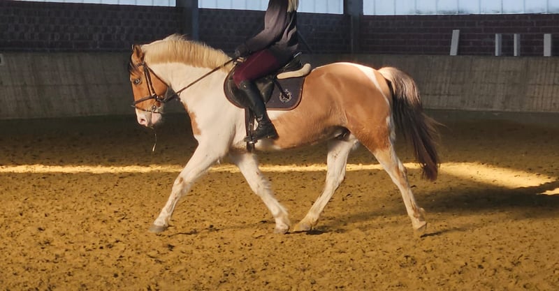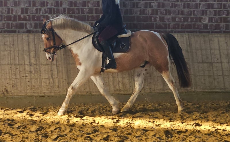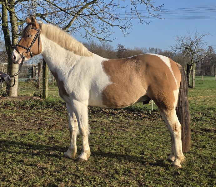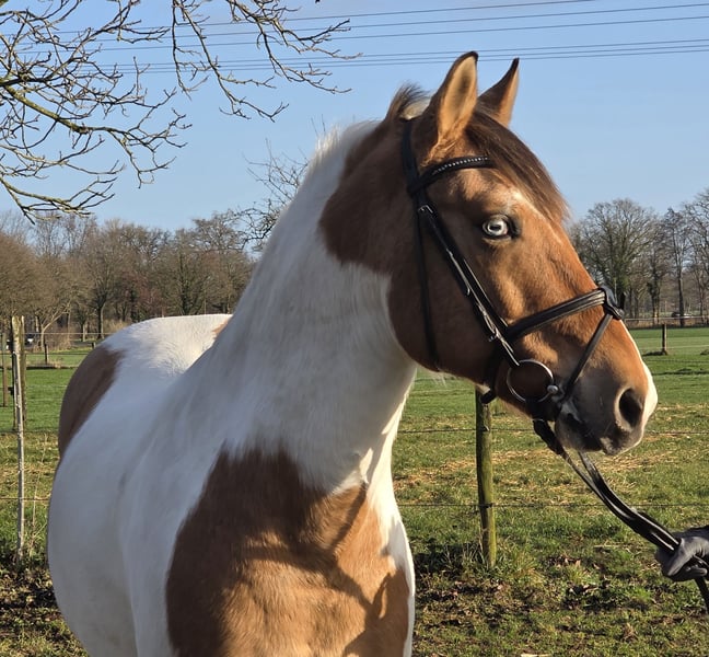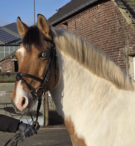 Our pony gelding Kalli stands approximately 152 cm tall. Yes, he is an excellent choice for larger riders—a pony with a solid foundation. :-) Kalli has two striking blue eyes, which make him truly unique. He is a charming and spirited character. As a typical gelding, he is playful and enjoys nibbling on things. ;-) Kalli has primarily been a leisure pony and currently competes at a good E-level. There is plenty of potential for further development, and he also enjoys jumping. Additionally, he is regularly ridden in the outdoor arena. Kalli is easy to ride and, importantly, he is very comfortable to sit—his back is gentle on the rider. Kalli has always been healthy, well-cared for, and loved. He is being sold reluctantly due to personal reasons. For more information, we look forward to your call at: 0177/2721831.