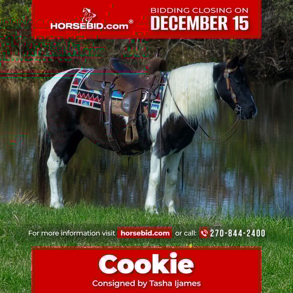 🎄𝐓𝐇𝐄 𝑯𝒐𝒍𝒊𝒅𝒂𝒚 𝐂𝐋𝐀𝐒𝐒𝐈𝐂🎄 Happening now thru MONDAY | DECEMBER 15th - Available EXCLUSIVELY on HorseBid's website! For more details and to register visit: www.Horsebid.com CONSIGNOR CONTACT: Tasha Ijames 270-844-2400 LOCATION: Henderson, KY BREED: Pony REGISTERED: No COLOR: Pinto HEIGHT: 12.3 AGE: 13 GENDER: Mare Cookie is a 13yr old black & white pinto pony mare standing 12.3hh. Cookie is broke, broke, broke for the little kids, bigger kids, and most adults. Cookie has spent her summer at a camp for kids where she was their trail companion and took care of each and every one of them. She is out standing on the trails and has been trail ridden extensively through many different types of terrain. She is sure footed and honest. Cookie is not spooky and will do all the obstacles, cross creeks, go through any body type of water, thick brush, logs, bridges, rough terrain, up and down cliffs with ease and will take care of her rider. Cookie is absolutely traffic safe on the roads. The dogs, heavy machinery, motorcycles and ATV’s does not upset her. You can ride Cookie out alone with ease or with other horses. Cookie has been ridden in the local parades, through drive ins and even through tractor supply. She loves all the attention she gets. Cookie will walk, trot and canter when asked but she prefers to just walk along. She will neck rein like a big horse or you can ride her two handed. Cookie has also been taken to local cattle sortings and loved it. She will stand still for you to get on her. She stands to be groomed, fly spray, stands still to be saddled, takes the bridle with ease, bathes good, loads like a dream, clips great, and stands for the farrier. Cookie is as close to perfect as one can get to take for a ride and teach kids the ropes. If you’re looking for a safe pony! Don’t miss out on Cookie. She’s looking for her forever home to please them kids. We invite anyone and everyone to come meet and ride Cookie at our barn in Henderson, Kentucky. We are happy to assist with transportation arrangements. PPE are welcomed at buyers expense. For any questions about Cookie please contact Tasha 270-844-2400