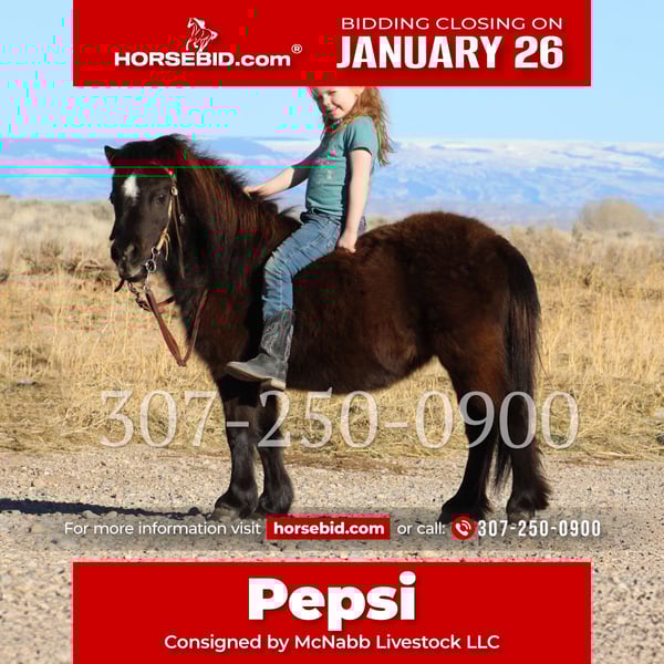𝐉𝐀𝐍𝐔𝐀𝐑𝐘 ⭐️𝑨𝒍𝒍 𝑺𝒕𝒂𝒓 𝑳𝒊𝒏𝒆𝒖𝒑⭐️ Happening now thru MONDAY | JANUARY 26th - Available EXCLUSIVELY on HorseBid's website! For more details and to register visit: www.Horsebid.com CONSIGNOR CONTACT: McNabb Livestock LLC 307-250-0900 LOCATION: Cody, WY BREED: Mini REGISTERED: No COLOR: Black HEIGHT: 27" AGE: 6 GENDER: Mare Pepsi is a cute little pony. Our 4yr old has had fun playing with her. She is great for a lead line and good for you little kids to learn on. She will go through the obstacle course and has been trail rode outside. Pepsi is also broke to drive making her fun for the whole family. For more information call 307-250-0900