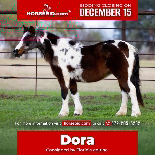 🎄𝐓𝐇𝐄 𝑯𝒐𝒍𝒊𝒅𝒂𝒚 𝐂𝐋𝐀𝐒𝐒𝐈𝐂🎄 Happening now thru MONDAY | DECEMBER 15th - Available EXCLUSIVELY on HorseBid's website! For more details and to register visit: www.Horsebid.com CONSIGNOR CONTACT: Florinia Equine 572-205-5282 LOCATION: Guthrie OK BREED: Pony REGISTERED: No COLOR: Bay roan tobiano HEIGHT: 47 AGE: 8 GENDER: Mare 🌟🐴 DORA – 8-Year-Old Bay Roan Tobiano Pony Mare • 48” • The Best Pony in the World 🐴🌟 Meet DORA, the pony every parent wishes they could find and every child dreams of owning. This 8-year-old, 48-inch bay roan tobiano mare is as gorgeous as she is dependable. With her striking roan coloring, bold tobiano markings, and long, flowing mane, she turns heads everywhere she goes. But beyond her beauty, Dora is truly the best pony in the world. 🧒 Bombproof • Kid Horse Deluxe • Babysitter Personality Dora is the kind of pony you trust without hesitation. Safe, steady, patient, and kind—she takes care of her rider no matter their age or experience. She’s a true confidence builder and a family favorite everywhere she goes. 💗 Sweetest Disposition Anywhere Dora LOVES attention and adores kids. She’s gentle to handle, easy to groom, and always willing. She’s the type of pony that follows you around like a puppy and soaks up every bit of love she can get. 🌲 Steady Trail Pony Point her anywhere and she will take you there. Dora is confident on the trail, crosses anything you put in front of her, and stays calm in new places. She’s the same no matter the weather, location, or rider. 🚙 Hauls Perfectly Loads, hauls, ties, stands—Dora makes traveling simple. Take her to a trail ride, a play day, camp, or the neighbor’s place; she’s relaxed and well-mannered everywhere. 🪶 Smooth, Comfortable, and Fun She’s easy for kids to sit, listens well, and has that gentle, forgiving nature every beginner needs. Whether it’s arena rides, leadline, or family fun, Dora is always safe and steady. 🌟 A Pony That Shines Everywhere Her bay roan tobiano color and beautiful long mane make her absolutely stunning in person. Combined with her bombproof temperament, Dora is the kind of pony people stop to admire. 🐴 Dora Is the Total Package Beauty, brains, safety, and sweetness—Dora has it all. Ponies like her are nearly impossible to find. She truly is the best pony in the world, and she’s ready to make one lucky kid’s dreams come true.