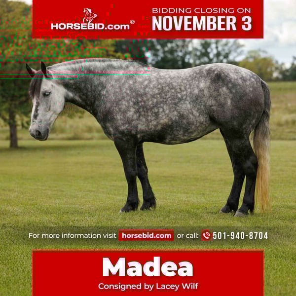 ⚜️𝐓𝐇𝐄 𝐅𝐀𝐋𝐋 𝐇𝐄𝐑𝐈𝐓𝐀𝐆𝐄 𝐂𝐋𝐀𝐒𝐒𝐈𝐂⚜️ Happening now thru MONDAY | NOVEMBER 3rd - Available EXCLUSIVELY on HorseBid's website! For more details and to register visit: www.Horsebid.com CONSIGNOR CONTACT: Lacey Wilf 501-940-8704 LOCATION: Quitman, AR BREED: American Draft Pony REGISTERED: Yes REGISTERED NAME: Outback Acres Queen COLOR: Dapple Grey HEIGHT: 14.1 AGE: 9 GENDER: Mare Madea is a 2016 model registered draft pony whose elegance is matched only by her versatility. Standing at 14.1 hands, she is the perfect height—substantial enough to carry the biggest adults with ease, yet accessible enough for younger riders, making her a true fit for all sizes. With her striking silver-dapple coat, strong bone, and graceful carriage, she is the very picture of refinement—substantial enough to impress, yet soft and feminine in her expression. She carries herself with poise in every setting, whether stepping into an arena, gliding down the trail, or moving gracefully in harness. She is as versatile as she is beautiful, riding both English and Western with ease and driving with the polished precision of a true lady. In harness, she is nothing short of exquisite—responsive, stylish, and steady, whether pulling a carriage through town, a buggy down country lanes, or working in a more formal setting. Her driving experience is extensive, and she moves with a fluid rhythm that makes her both a pleasure to watch and a joy to handle. Always soft in the lines and confident in her step, Madea exemplifies grace and dependability as a driving pony. Nothing seems to ruffle her composure—she remains unbothered by tarps, flags, fireworks, heavy traffic, or even the hum of a drone. The fast-paced hustle of the cow sale doesn’t disturb her, further proving her unshakable mind and steady presence. On the trail, Madea’s elegance shines through in her balance and confidence. She takes water, bridges, logs, and brush with the same calm assurance as she does the open road. Every ride with her feels effortless, enjoyable, and distinguished, making her a partner who elevates even the simplest outing into something memorable. Yet it is her personality that truly sets her apart. Madea adores attention and soaks up every moment of admiration, greeting people with kindness and warmth. She is gracious on the ground—easy to catch, gentle with her feet, and perfectly mannered to saddle, bridle, wash, and haul. Her natural class and calm demeanor make her a favorite in any barn, and her presence is one that cannot be overlooked. Elegant, gentle, and endlessly capable—Madea is not just a pony, but a statement piece: one who embodies grace, substance, and timeless beauty while being safe and dependable in every way.