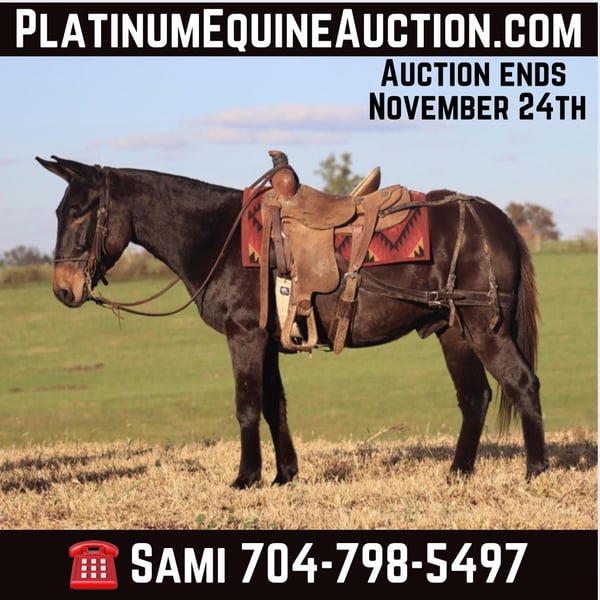 ONLINE AUCTION Place your bids at www.PlatinumEquineAuction.com Starting Bid $3500 Auction ends November 24th, 2024 Need a new saddle? Check out White Rock Saddles on our website or Facebook! Pepper is a 9 year old, 14.3 hand John mule. Pepper is that reliable mule that you know you can pull out and he will get you safely where you need to go. He stands tied quietly to tack up. He stands to mount, and he will ride off the same every day whether you ride him every day, once a month, or once a year. He is a mountain goat when it comes to the trails. There is not terrain to rough for this guy. He is careful with where he puts his feet. He steps over logs, crosses water, goes up and down banks, slides down soft rock and clay banks, and will go just about anywhere else you want to go. He travels out alone or with the group. He is a great hunting mule. He has been out on 3rd season Colorado Elk Hunt this year. You can saddle him up in the dark and ride out to scout elk. You can ride him with your backpack on and gun sling attached. He stands quietly when you need to stop and scout. He doesn’t get rattled if you come across mule deer, or even white tail back in the east. He stands out on the highline overnight with no issues. Pepper gets along great in a herd situation when turned out. He neck reins. While I would not call him truly gaited, he has an extremely nice, ground covering walk. He gets into a rhythm and he starts head shaking and ear flopping with the best of them! He also has a very nice, smooth rocking chair lope. Pepper is just a nice mule that is reliable and ready for the day when you get him out to work. For more information, please call Sammi Waugh at 704-798-5497 Located in Brooksville, KY. ONLINE AUCTION Place your bids at www.PlatinumEquineAuction.com Starting Bid $3500 Auction ends November 24th, 2024 Need a new saddle? Check out White Rock Saddles on our website or Facebook!