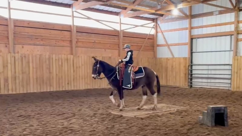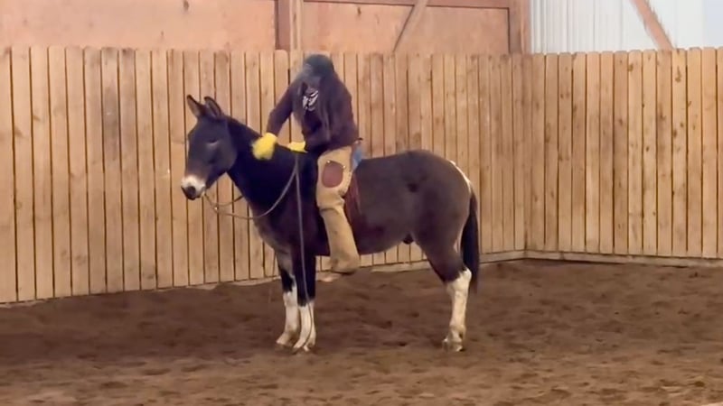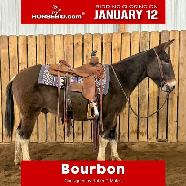 ♦️𝐍𝐄𝐖 𝐘𝐄𝐀𝐑'𝐒 𝑬𝒙𝒕𝒓𝒂𝒗𝒂𝒈𝒂𝒏𝒛𝒂♦️ Happening now thru MONDAY | JANUARY 12th - Available EXCLUSIVELY on HorseBid's website! For more details and to register visit: www.Horsebid.com CONSIGNOR CONTACT: Rafter D Mules 651-303-7056 LOCATION: Hastings, MN BREED: Mule REGISTERED: No REGISTERED NAME: Bourbon COLOR: Grullo Paint HEIGHT: 14 AGE: 11 GENDER: John Mule Bourbon is the type of mule that every family needs. If you can hold the reins, you can ride him. He is as honest as the day is long. Above all, Bourbon is gentle and safe, he has absolutely earned our trust. He suits any rider, from beginner to advanced and everything in between. Bourbon is 11 years old, and the perfect age for a seasoned trail mount. He is absolutely safe and has more experience out on the trails than Lewis & Clark. At 14h he is easy to get on, but he will also stand at a mounting block or log to be mounted. Bourbon will walk, trot, and lope in both leads correctly. He rides under saddle as well as bareback, with a bit or a war bridle. He is a trooper when it comes to our obstacles and horseplay, amicably allowing us to be entertained whether riding double or playing with the ball! He is a mature John mule that is put together as nicely as you could ask for, and his chrome is the cherry on top. Bourbon is like the whiskey he is named after; he just keeps getting better with time. Bourbon will cross downed timber, water, and anything you could imagine finding out on the trails. He is used to small pets, wildlife, and all types of weather. He has been on many overnight camping trips. He rides quietly inside and outside. Bourbon loads and hauls well and has even been hauled in a slant load trailer. He gets along with other pasture mates, is easy to catch, bridles easily, stands quietly to be clipped, and is a gentleman when having his feet and ears handled. Bourbon is truly the mule that will get along with any level or age of rider. Anyone! He has a kind eye, and a sweet disposition. If you would like to meet Bourbon or have any questions prior to the auction ending, please contact Dillon at 651-303-7056.