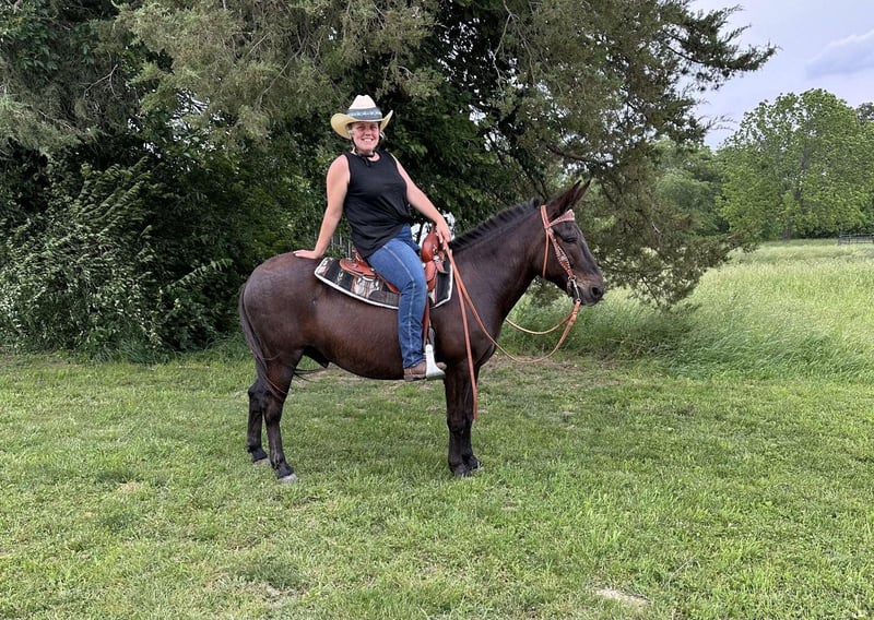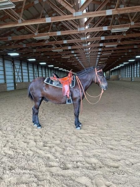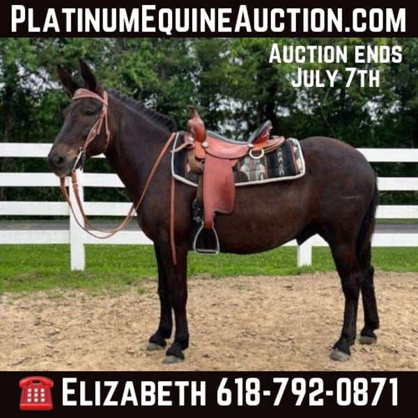 ONLINE AUCTION Place your bids at www.PlatinumEquineAuction.com Starting Bid $3500 Auction ends July 7th, 2024 Need a new saddle? Check out White Rock Saddles on our website or Facebook! Meet Cash! Cash is an 11 year old, 14.1H, beautiful John mule. He is great with his ears, stands tied quietly, and saddles like a gentleman. He has solid barefoot feet, and the farrier was just out this week. Cash will walk, trot, and canter both directions, but he really shines out on the trails. He is not afraid of traffic, semis, 4-wheeler, side by sides, or tractors, and he crosses water like a champ. He will go out on the trail by himself or with a group. Cash is a sound, and no maintenance, stunning mule. He is up to date on his shots, and ready for a new trail partner! For more info contact Elizabeth Ellett 618-792-0871 Located in Freeburg, IL. ONLINE AUCTION Place your bids at www.PlatinumEquineAuction.com Starting Bid $3500 Auction ends July 7th, 2024 Need a new saddle? Check out White Rock Saddles on our website or Facebook!