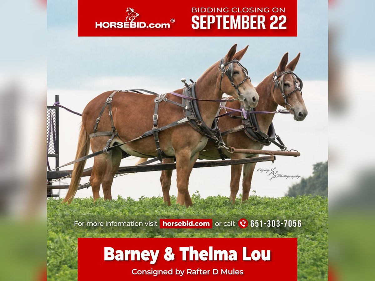🍁𝒕𝒉𝒆 𝐅𝐀𝐋𝐋 𝑺𝒑𝒆𝒄𝒕𝒂𝒄𝒖𝒍𝒂𝒓🍁 Happening now thru MONDAY | SEPTEMBER 22nd - Available EXCLUSIVELY on HorseBid's website! For more details and to register visit: www.Horsebid.com CONSIGNOR CONTACT: Rafter D Mules 651-303-7056 LOCATION: Hastings, MN BREED: Mule REGISTERED: No COLOR: Blonde HEIGHT: 14.2 John - 14.3 Molly AGE: 13 GENDER: John Mule Have you spent your life dreaming of having your own team of mules to take you, your friends, and your family on wagon rides through the scenic trails of the countryside? Meet Barney and Thelma Lou! We are proud to offer this team that is beginner friendly, safe enough to trust with your family, and as honest as the day is long. While they are confident hitched side by side under harness, they are also broke to ride and pack! Barney and Thelma Lou are a well-trained team that can be easily hitched by one person. They have been used on wagon trains, working around the farm, and have been hitched to all types of farm equipment including grain wagons. They ride well together and also pack well together. This handsome couple are in the prime of their life and would make a great addition to anyone's farm as well as family. Barney and Thelma Lou are both easy to catch, not ear shy, and are both used to having their feet handled. Whether driving down the highway, gravel road, or through the fields, this team is easy to handle and so much fun to work with. Thelma Lou has a mass on her lower left side. It has been examined by a veterinarian, and they stated that it was comparable to a wart and was not of any concern. We absolutely love this team and know that you will too! If you have any questions about Barney and Thelma Lou or would like to meet them prior to the auction ending, please contact Dillon at Rafter D Mules 651-303-7056.
