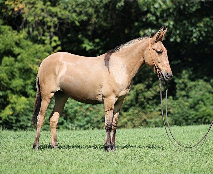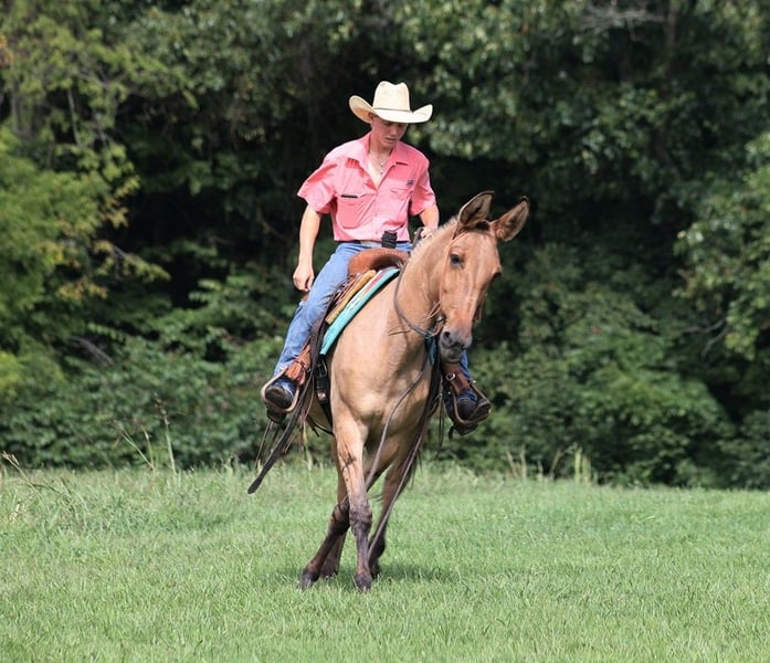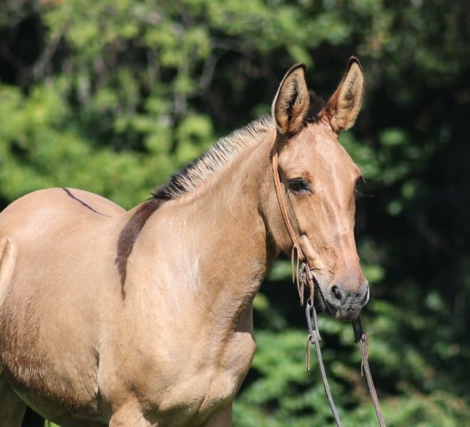 ONLINE AUCTION Place your bids at www.PlatinumEquineAuction.com Starting Bid $3500 Auction ends September 1st, 2024 Need a new saddle? Check out White Rock Saddles on our website or Facebook! Talk about a RARE find!!! Liddy is total eye candy but the best part about her is more than what meets the eye! Liddy is a 13 year old, Buckskin Molly(mare) Mule with dun stripes that is standing around 15.1H. Liddy has the color, the size, the mind and the rideability! Liddy is easy to handle, she tacks up quietly, is fine with her ears and feet as well. Liddy has been with me all since back in early spring and I have used her for trail riding and ranch work. She has been out on some cow catching jobs and handles herself with poise even in tense high stress situations. She has roped in the pasture, held the rope tight while I tied them down, drug cows on the trailer and stands her ground against mad ones. Out on the trails, Liddy is great and loves to go trail riding. She will cross obstacles and goes over any terrain. She has been exposed to all kinds of wildlife such as deer or turkey and will go anywhere that she is asked too. She will go up or down even the steepest slopes, across deep creeks, over downed trees, and over all types of rough terrain while still being sure footed. Liddy will lope nice circles, she takes her leads, stops and backs as well. She has been rode in traffic, and is very traffic safe around cars, semi, log, and dump trucks. She has a great attitude about whatever she is asked to do. Feel free to call Moore Trained Horses Logan 765-265-0033 any questions. Located in Level Green, KY. ONLINE AUCTION Place your bids at www.PlatinumEquineAuction.com Starting Bid $3500 Auction ends September 1st, 2024 Need a new saddle? Check out White Rock Saddles on our website or Facebook!
