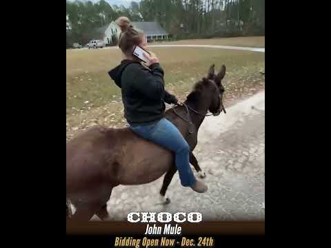 “Choco,” the mule! He is a very curious and sweet mule. First to meet you at the gate every time. Choco loves attention, but especially children. While Choco is young he is an experienced babysitter! With more whoa than go, this flashy gelding is an excellent trail riding companion! He gets along great with other animals, and he is always ready for an adventure! Sure-footed and smooth, Choco also lies down on command for his riders to mount up! This mule is a barn favorite and flashy to boot!