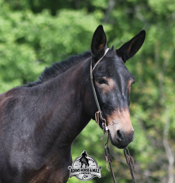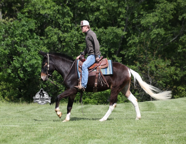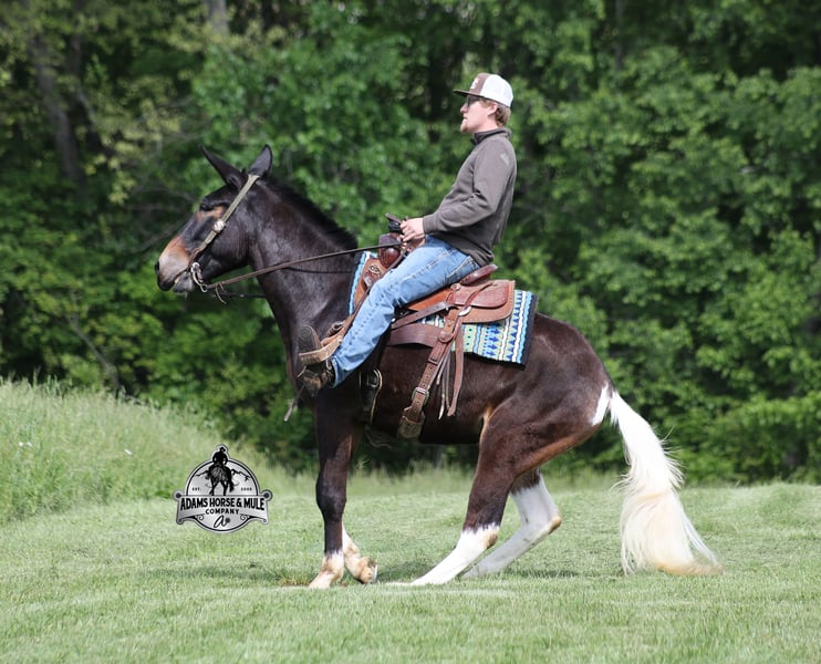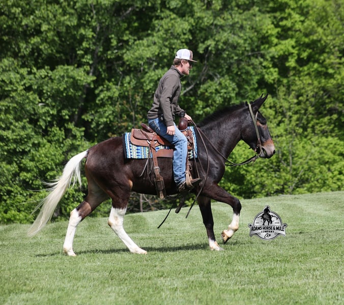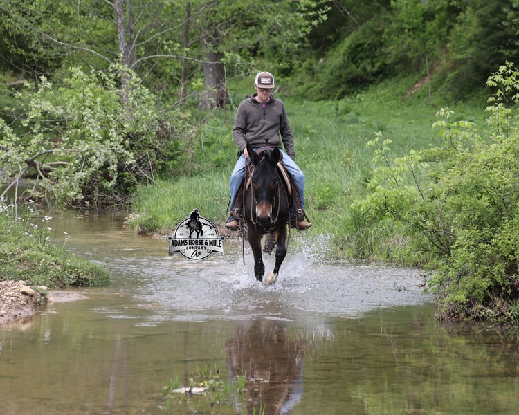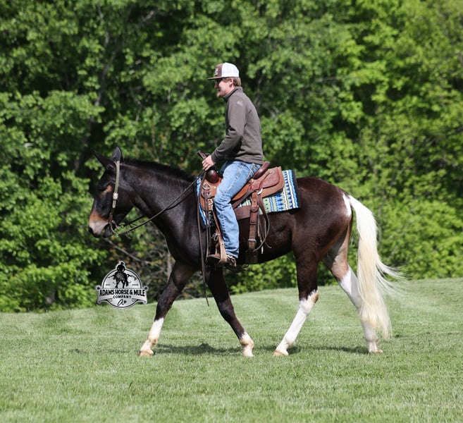 If you are a lifelong mule fan or just looking for your first one… Lariat is the one for you!!! If you want smart, reliable, easy going, user friendly, safe and a best friend… all wrapped into one??? Here he is! Lariat was started and trained by the best in the business when he was two and a half years old and has graduated the natural horsemanship program where he learned several tricks (side passing to a mounting block, laying down for mounting and setting on his rump) doing the natural horsemanship program also allowed Lariat’s personality to shine as he is a total in your pocket kind of fellow and is everyone’s best friend! He is 4 years old, is 15.1h and is well built. Lariat is a mule for all jobs… he is out of a Color Me Smart ($3.6 million sire) bred mare, so he is bred to ride around the ranch and knows cows! Whether you need to head out on the ranch and herd some cattle, need to heel calves and drag them to the branding fire, if you just want to ride some beginner type trails, if you want to go hunting up in the high country of Wyoming or Colorado and tackle the roughest of all trails, if you want to hook up and take a Sunday afternoon carriage ride, maybe you just want a friend to lay down under a shade tree and talk to… Lariat will do it all!!! He is super safe, absolutely no foolishness or bad habits. He is easy with feet and ears. Lariat has been ridden by all ages from 6 to 76 and is 100% safe. On the trails he is great and will cross creeks, ditches, logs and navigate rough, rocky areas. He has been ridden many miles in the mountains of Eastern Kentucky and encountered every obstacle possible on the trails. He has been on several week long camping trips. He has been elk hunting out west and also has been packed. He hauls well and picket line ties and ponies. He will go up or down even the steepest slopes, across deep creeks, over downed trees, and over all types of rough terrain while still being sure footed. Lariat has been ridden at night, lead dogs and been coon hunted off of, gun fire does not bother him. Lariat is fancy broke and well trained! He will one hand rein around, spin circles, side pass and back with ease. He will lope perfect circles and slide stops! He has been exposed to all kinds of wildlife such as deer or turkey and will go anywhere that he is asked too. You will drive the wheels off of a new truck to find one that even close to Lariat, we invite anyone to come see in person just how special he is or we can facetime with you as well. Just give us a call and feel free to call Eric 606-308-2461 with any questions. Go to visit our website for more pics and a video www.AdamsHorseAndMuleCo.com AHAMC has been in the horse business and sold horses over the internet since 2005. We have a long track record of success with hundreds of happy customers. We work hard to match riders with the correct horses and specialize in beginner safe, family friendly horses that have been used and checked out by our family! We can set up transportation anywhere in the US and look forward to working with you.