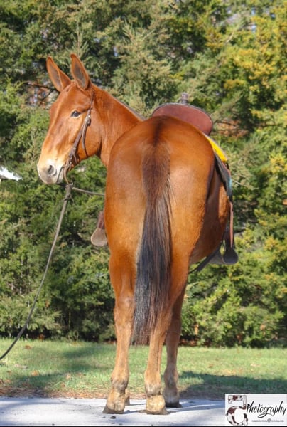 ONLINE AUCTION Place your bids at www.PlatinumEquineAuction.com Starting Bid $3500 Auction ends January 19th, 2025 Need a new saddle? Check out White Rock Saddles on our website or Facebook! Annie is a well-built sorrel molly mule standing around 15 hh, & she is 10 years young. She is very well broke mule that will back up, turn around, neck rein, lope & has a good stop. She is good with her ears, legs, tail, etc. I do not think this mule has a mean bone in her body. She stands to be clipped, bathed, & brushed. I have never seen her make a wrong move. Annie is always ready for her next adventure!! She’s kid tested & mother approved for husbands, grandmas, mamas, brothers, cousins, or your friends who have never seen a mule. She has been ridden around farm equipment, ATV’s, dogs, & you can shoot a gun on her. She is also broke to drive!! Absolutely no buck or spook!!! She’s been around cattle, roped on, & used in brandings. She will be the most honest trail riding mount you’ve ever swung your leg over. She has been ridden many miles in hills of Southern Indiana & Ohio. She has encountered every obstacle possible on the trail. She will go up or down even the steepest slopes, across deep creeks, over downed trees, & over all types of rough terrain while still being sure footed. We have ridden her down the road many times & she isn’t bother by any sort of vehicle that passes her. Our kids catch her, halter her, & lead her wherever they want to go. She’s one of the friendliest mules I have ever been around. She has a great attitude about whatever she is asked to do. One lucky person is about to get the love of their life with this gal!!! She could take someone in any direction: check your herd, any aspect of ranch life, coon hunting, cart rides, or just sightseeing on the trails. You can leave her turned out for months & catch her up & I promise she’ll be the same mule as she was when you turned her out. Located in Everett, PA. Contact Benny Hall 814-979-2046 with any questions. ONLINE AUCTION Place your bids at www.PlatinumEquineAuction.com Starting Bid $3500 Auction ends January 19th, 2025 Need a new saddle? Check out White Rock Saddles on our website or Facebook!