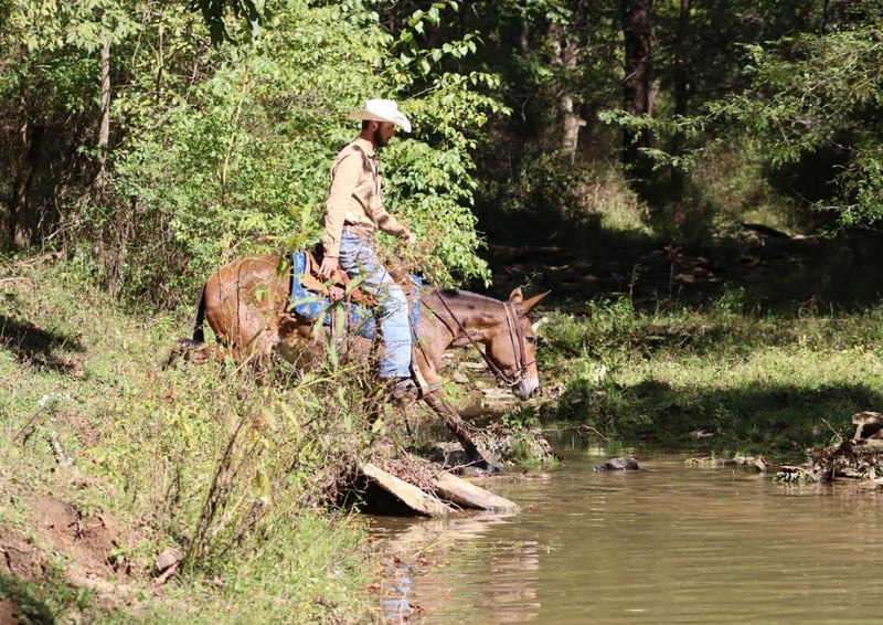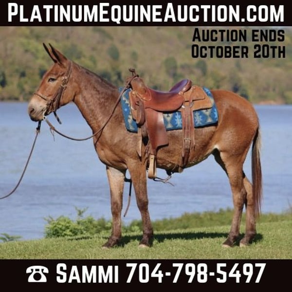 ONLINE AUCTION Place your bids at www.PlatinumEquineAuction.com Starting Bid $3500 Auction ends October 20th, 2024 Need a new saddle? Check out White Rock Saddles on our website or Facebook! Bella is a 10 year old, 13.3 hand Molly mule. Don’t let her pint size fool you, she can comfortably carry an adult all day long. One of our favorite things about Bella is her mountain goat abilities when out riding. No hill is too steep, no trail is too narrow. If there isn’t a path, Bella will blaze one. If you’re not the trail blazing type, she will happily cruise down wider, more user friendly trails. She walks, jogs, and lopes nicely across the pastures. Hop on and go check cattle or fences, she is game! Is coon hunting your thing? She is an experienced coon hunting mule. She’s comfortable riding out with the hounds and confident at night. Bella is traffic safe. She has ridden around cars, trucks, motorcycles, golf carts, strollers, and more! We have even had her at the local rodeos and fairs riding through the vendor areas. The bright lights and crowds don’t phase her. Her biggest quirk, is riding away from the trailer and leaving buddies behind, she will require a little extra encouragement from her rider to make sure you really want to leave everyone behind. Once you get headed down the trail though, she doesn’t have any issues even out alone. Don’t miss out on this cute and fun Molly mule! For more information, call Sammi Waugh 704-798-5497. ONLINE AUCTION Place your bids at www.PlatinumEquineAuction.com Starting Bid $3500 Auction ends October 20th, 2024 Need a new saddle? Check out White Rock Saddles on our website or Facebook!