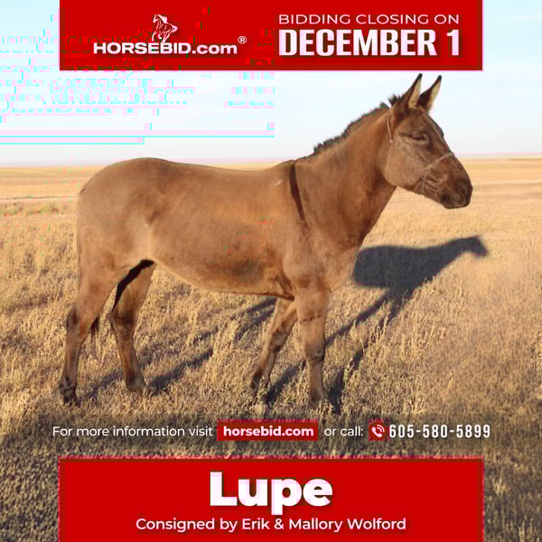 ⚜️ 𝓽𝓱𝓮 𝐇𝐨𝐫𝐬𝐞𝐦𝐚𝐧'𝐬 𝓢𝓱𝓸𝔀𝓬𝓪𝓼𝓮⚜️ Happening now thru MONDAY | DECEMBER 1st - Available EXCLUSIVELY on HorseBid's website! For more details and to register visit: www.Horsebid.com CONSIGNOR CONTACT: Erik & Mallory Wolford 605-580-5899 LOCATION: Whitewood, SD BREED: Mule REGISTERED: No COLOR: Grulla HEIGHT: 14.3 AGE: 6 GENDER: Molly Mule Lupe is the real deal — a ranch-raised, well-bred mare mule with the brains, build, and background to go in any direction. 📌 Outstanding Pedigree Her sire is the late Really Dun It — a 4-time World Champion jack known for producing mules with exceptional minds, trainability, and athletic ability. His offspring have excelled in multiple disciplines, earning national and world titles while also making trustworthy trail and ranch partners. Her dam is a granddaughter of PC Frenchman’s Mark, going back to Frenchman’s Guy, bringing proven performance horse blood to the cross. 📌 Ranch Proven Lupe has done all aspects of ranch work including: • Calving (many long days and night shifts) • Branding • Sorting — she’s especially fun and handy in the pens • Countless miles outside She’s confident, sure-footed, and honest. Stays gentle, stays broke, and is the same mule every ride. 📌 Versatile & User-Friendly Whether you’re looking for a performance prospect to take to mule shows, ranch versatility, trail classes, or you want a reliable partner the whole family can ride, Lupe checks all the boxes. She’s got the mind, the breeding, and the miles.