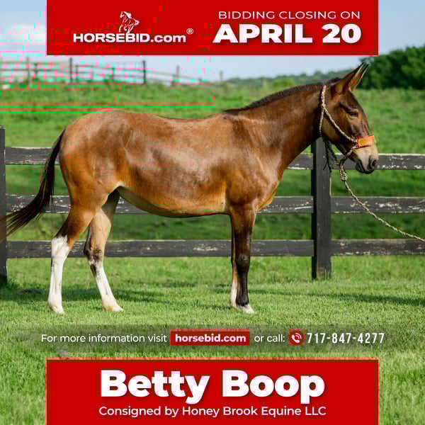 Betty Boop is one of the best trained mules you'll find that's for sale ,she has 3 smooth gaits you'll never get tired of ,a walk that is comfortable on the trail all day,a trot you can easily sit for hours, and a lope that anyone can ride..