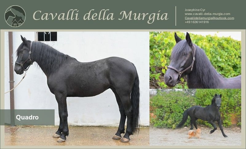 Quadro Quadro is five years old, stands 1.64 meters tall, and is a gelding who is more than just a riding horse. He is a partner, a teacher, and a true talent. Anyone who gets to know him immediately senses: this horse is something very special. He doesn’t just want to be ridden — he wants to be understood. Those willing to connect with him will find a horse that helps the rider grow and takes them on a journey far beyond just riding. Initially, Quadro was cautious, but with patience and trust, he has developed into a horse that excites. Today, he shows sensitivity in the best sense, is a pleasure to ride, and always honest in his feedback. He strives for perfection, which makes him an excellent teacher and partner for ambitious riders. Quadro possesses everything one could wish for in a dream horse: immense talent, impressive potential, and an aura that captivates everyone. In handling, he is absolutely straightforward — calm at the blacksmith, loading him is no problem, and he is always cooperative. Working with him will help you grow beyond your limits. Quadro is not looking for just any rider but someone who can feel, understand, and is ready to achieve great things together. X-rays are available upon request, and the complete purchase process, including a pre-purchase exam, is organized by Cavalli della Murgia. Choosing Quadro means opting for a horse that is not only exceptional but also has the potential to become a true heart horse.