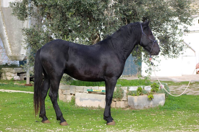T.F. Proust Tequila Open-minded, very gentle in handling, and playfully cheeky – these words aptly describe Tequila. In the round pen, Tequila is very attentive to his handler and reacts to the slightest changes in body language. He is very affectionate towards people, always up for a little joke ;-). Tequila grew up with some buddies in the herd of the breeder from whom we are now allowed to offer him. He is familiar with life on a masseria, which means: dogs, guard geese, cows, tractors, and more dogs. He has professionally learned the basics of young horse training and is now looking forward to the next steps in his education with you. Currently, Tequila is not castrated but can be upon request and will be done by the breeder (included in the price). Born in 2023, his estimated final height is around 16.1 hh. If you would like to know more about Tequila – we look forward to your message. X-ray images are available and can be viewed upon serious interest. We will also handle everything else for you – clinical pre-purchase examination, contract processing, transport to your home stable, and more. Cavallo Murgese.de – on behalf of and in cooperation with the Italian Murgese Association A.N.A.M.F.