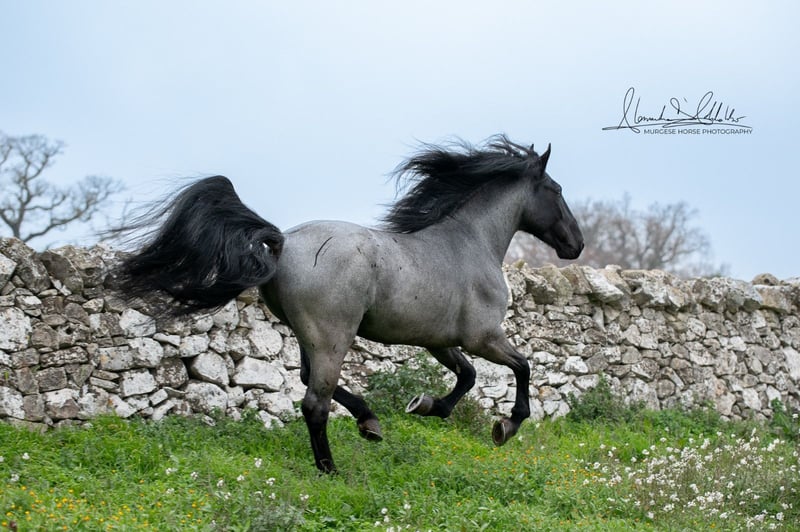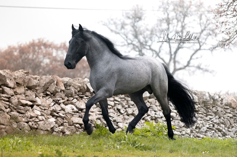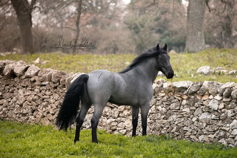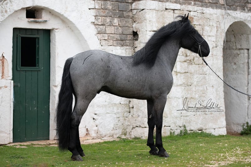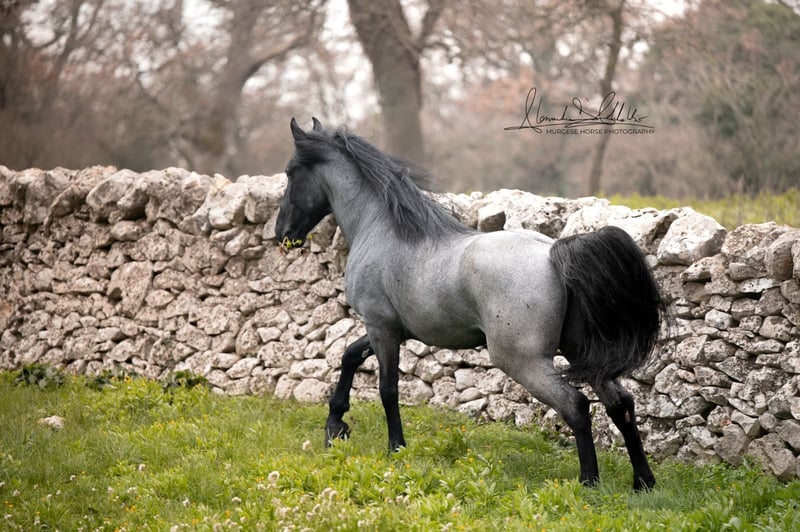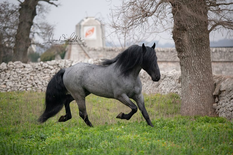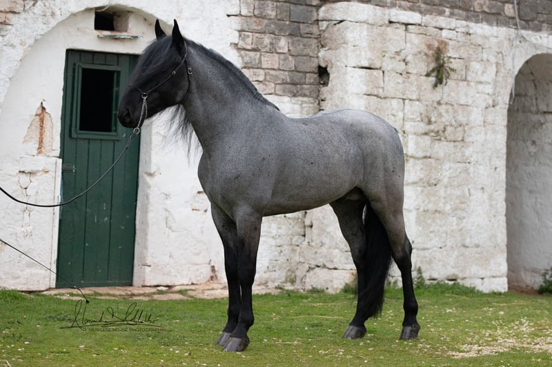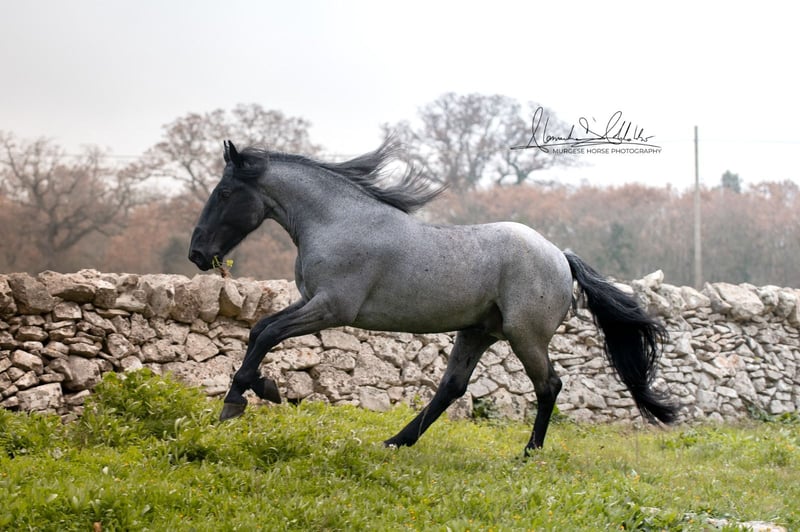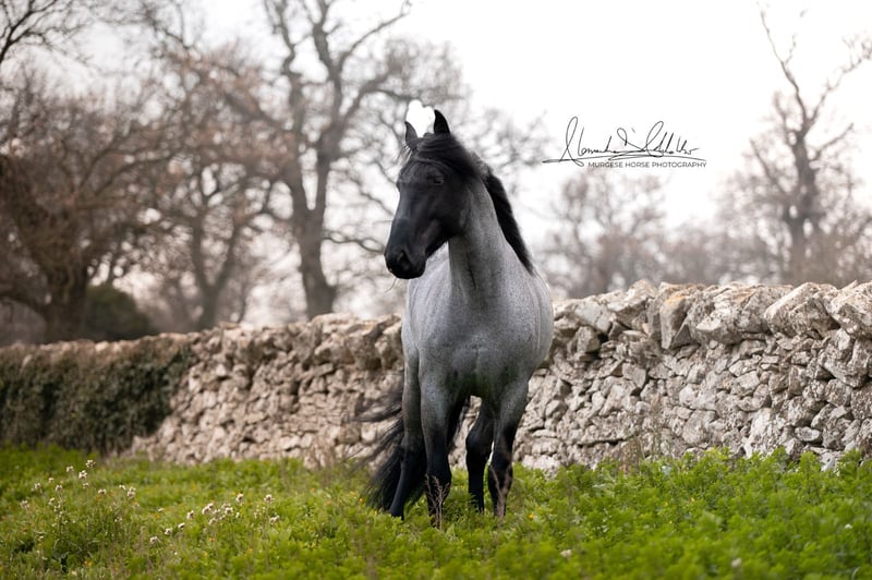 If you are looking for a special horse with a lot of potential and charm, then Pericle might be just the right one for you. Pericle stands out not only for his rare and impressive special color Blue Roan but also for his honest character. He is familiar with the saddle and has been ridden, although his last ride was some time ago. His height is approximately 160 cm. Pericle is currently still a stallion in Italy. He can be castrated upon request (already included in the price). We look forward to inquiries – further information and videos are of course available. Do you want to meet Pericle in person? Then join us on a journey to his homeland in Apulia. X-ray images are of course available. A vet check can be conducted on-site upon request. We also plan everything else for you - handling the purchase contract, transport to your home stable, etc. Cavallo Murgese.de - on behalf of and in collaboration with the Italian Murgese Association A.N.A.M.F.