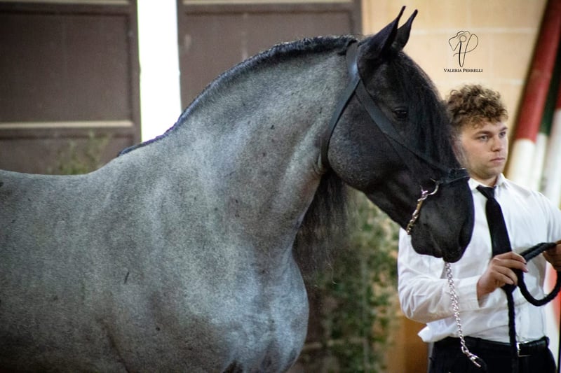 Si buscas un caballo especial con mucho potencial y encanto, tal vez Pericle sea justo lo que necesitas. Pericle destaca no solo por su color raro e impresionante, Blue Roan, sino también por su carácter honesto. Conoce la silla y ya ha sido montado, aunque su última salida en el silla fue hace algún tiempo. Su altura aproximada es de 1,60 m. Actualmente, Pericle aún se encuentra en Italia como semental. A petición, puede ser castrado (esto ya está incluido en el precio). Estamos encantados de recibir consultas; por supuesto, podemos proporcionar más información y videos. ¿Quieres conocer a Pericle en persona? Entonces acompáñanos en un viaje a su tierra natal, Apulia. Por supuesto, disponemos de radiografías. También podemos realizar una revisión veterinaria completa en el lugar, si así lo deseas. Además, nos encargamos de todo lo demás por ti: gestión del contrato de compra, transporte a tu establo en casa, etc. Cavallo Murgese.de – en colaboración y en nombre de la Asociación Italiana de Murgese A.N.A.M.F.