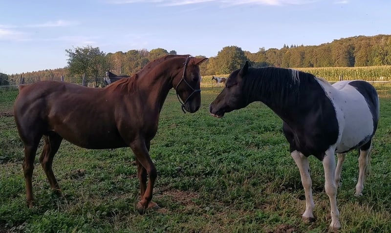 Achor est arrivée chez nous en 2021 depuis les vastes étendues du Canada. Elle est issue de deux captures sauvages. C'est une jument fine et discrète. Une mère attentionnée, elle est également capable de mener un troupeau avec brio. Elle sait aussi bien se soumettre. Sa mère, âgée de presque 30 ans, dirige encore le troupeau au Canada. Jusqu'à présent, elle a toujours donné, avec l'étalon coloré, des poulains excellents, très compacts et grands. Elle a été saillie par lui le 11/08/2024. Son poulain est donc attendu pour la mi-juillet. Les poulains issus de cet étalon coloré étaient toujours colorés, avec peu de blanc. Ils ont été vendus à des prix élevés. Avec l'étalon doré, elle a donné naissance à un étalon alezan foncé. Jusqu'à aujourd'hui, elle a eu 2 juments et 2 étalons. Elle se débrouille seule pour le poulinage. Nous avons également d'autres juments à vendre, ainsi qu'Ari, notre étalon doré. Vous pouvez constituer votre propre petit troupeau de mustangs, car tous se connaissent entre eux.