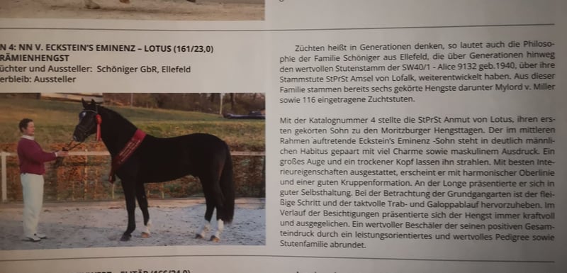 Die Hengste MYLORD und EXZELLENZ decken im Natursprung. Beide Hengste sind prämiert und vertreten die Attribute ihrer Rasse nach vorbildlichem Maßstab. Überdurchschnittlich gute Bewegungsabläufe und eine äußere Erscheinung ohne Fehl und Tadel. Beeindruckend ist die Gelassenheit, der Arbeitswille und die menschenfreundliche Art der Pferde. Prämienhengst MYLORD, dunkelbraun, geb. 2011, Bundeschampionat gelaufen, lebenslang anerkannt für Dänemark, Dressur bis Kl. M, Lehrmeister im Geschirr für Jungpferde im Zwei- bis Sechsspänner Neugebründer der M-Linie WH 165,0 cm, Röhrbein 22,5 cm 50-Tage-Test 2014 erfolgreich absolviert, Note 9,00 für Umgänglichkeit und Verhalten Mutter Alphe ist Prämienstute*** und bei der FN im Leistungsstutbuch 19 Championatsfohlen, 21 weitere in Championatsqualität (1a prämiert, aber nicht zum Championat vorgestellt) 10 Staatsprämienstuten, 8 Hengstanwärter, 1 Sohn gekört EXZELLENZ, schwbr., geb. 2023, von Ecksteins Eminenz - Lotus, in Moritzburg gekört und prämiert, ein kraftvoller, ausbalancierter Hengst mit größter Körperharmonie und stabilen Fundament. Für sein Wesen müsste er ein Extra-Sternchen bekommen. An seinen Fohlen bekunden wir großes Kaufinteresse! https://www.g-e-h.de/rassebeschreibungen/45-pferde/588-saechs-thuering-schw-warmblut für weitere Informationen bitte die Texte auf den Fotos vergrößern Unterbringung von Stuten möglich Besichtigung nahezu jederzeit möglich. Bitte vorher kurz anrufen, Tel. s.u. Für Spätentschlossene: Präsentation der Hengste zur Stutbucheintragung am 12. Mai 2026 in Ellefeld Decktaxe 350,00 Euro Fragen Sie nach unserem Rabatt für Prämienstuten! Schöniger-Pfer.de RFV Ellefeld Jahnstraße 14 08236 Ellefeld Tel. 03745 6438 (Arndt) 015253222116 (Philipp) 017672152448 (Gunter)