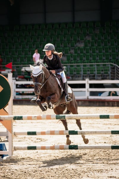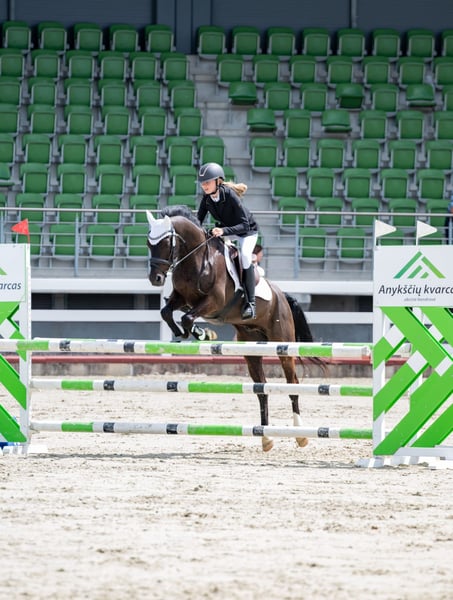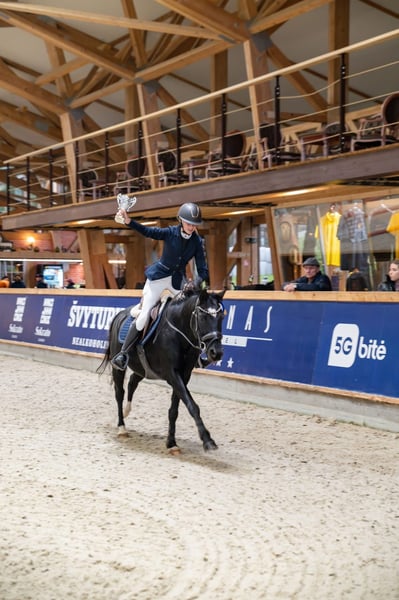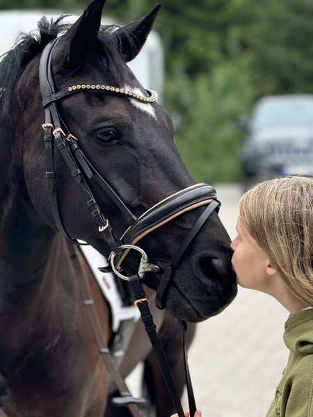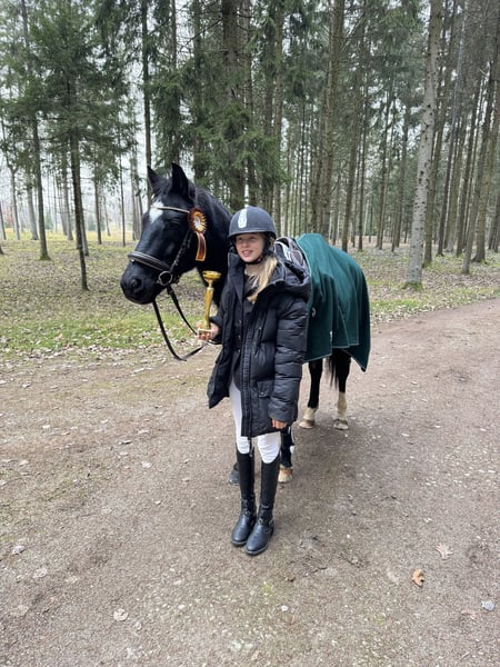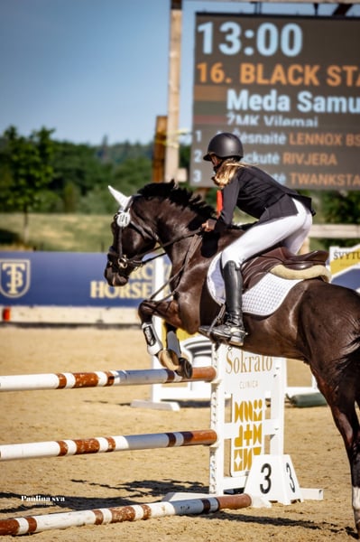 Our beloved pony Black Star, who was my daughter’s first horse when she turned 11. He has an exceptionally calm and gentle nature, always careful and reliable. An ideal pony for a child who wants to learn, progress, and gain confidence. He is also a motivated partner when riding, eager to please. BlackStar is a real eye-catcher for his beautiful black coat. Together with my daughter, he has participated in many show-jumping competitions and has earned several placings. He has helped her grow tremendously as a rider, and they developed a very strong bond. Sadly, my daughter has outgrown him, which is the only reason we are letting this wonderful pony go. In competitions he has comfortably jumped 90 cm, and at home up to 110 cm. He is also suitable for dressage. A truly amazing pony looking for a new little rider to love and learn with. The pony was born and raised in the Netherlands, from where we brought him to Lithuania, where he currently lives. BlackStar has always been very well cared for — he has been given high-quality food and his hooves have been maintained regularly.