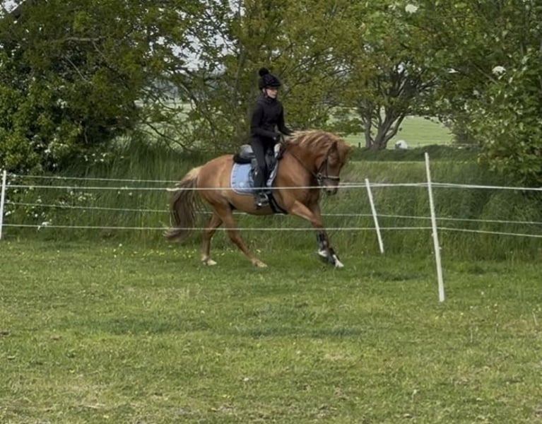 Our little one is looking for a new home. He loves to work hard, as he is not a lazy horse at all. He is absolutely well-behaved when tied up and on the lunge. He has just completed his first show jumping course, where he showed great potential over the jumps; he just needs a bit more routine and pulls nicely to the jump! I wouldn't classify him as a pure beginner pony; you should have some riding experience, as he is still young and really eager to work. He has been backed, enjoyed some time in the pasture, and is now back under saddle. I can easily imagine him as a leisure partner, but definitely also at competitions; he is a true all-rounder and is willing to try anything, especially when he trusts you. Father: Poppings Marribo, bay, 145 cm Mother: Jurina, dark chestnut, 145 cm