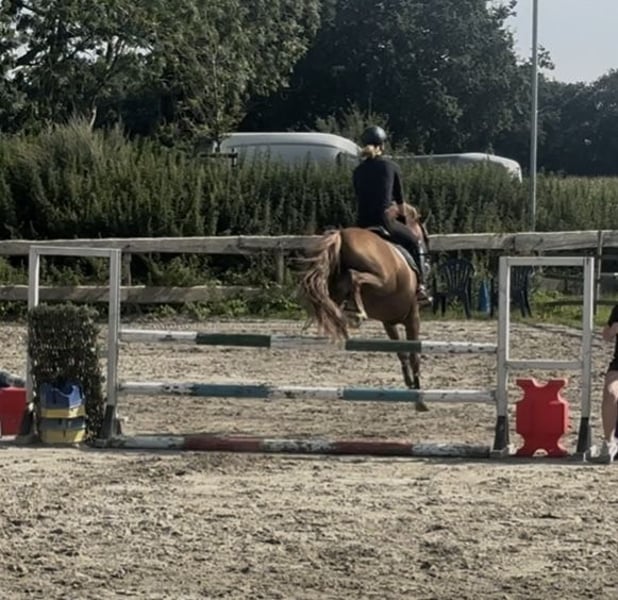 Onze kleine zoekt een nieuw thuis, hij houdt ervan om hard te werken, hij is geen slaapkop. Hij is absoluut braaf aan de lijn, aan de longe... hij heeft net zijn eerste springparcours voltooid, waar hij behoorlijk potentieel laat zien bij het springen, hij moet alleen nog wat routine opdoen, maar hij trekt goed aan bij het springen! Ik zou hem niet als een puur beginnerspony beschrijven, je moet wel wat ervaring hebben met rijden, aangezien hij nog jong is en echt hard werkt. Hij is ingereden, mocht daarna nog even van het gras genieten en is nu weer volledig onder het zadel... Ik kan me hem heel goed voorstellen als recreatiepartner, maar zeker ook op wedstrijden, hij is een echte allrounder en doet alles mee, probeert graag nieuwe dingen en laat zich overtuigen als hij je vertrouwt... Vader: Poppings Marribo bruin 145 cm Moeder: Jurina donker vos 145 cm