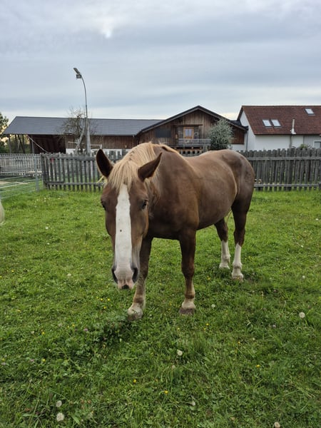 Our Guti is kept in an open stable and has a low social rank. He is familiar with all the other animals on the farm, including chickens, sheep, goats, and pigs. He has been ridden in the terrain, and he knows lunging and groundwork. He has plenty of interaction with children here on the farm. He loves being groomed by them and leads calmly. Gymnastics, playing with a ball—none of these are a problem for him. Guti wants to be involved in everything and learns quickly and obediently. He needs a good home with new challenges to keep him engaged.