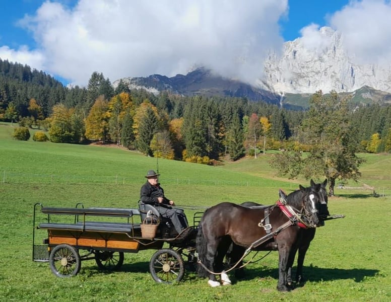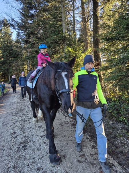 Larissa ist 11 Jahre alt und 159 cm. Die Norikerstute kann auch von Kindern oder Anfängern geführt und geritten werden. Auch bestens geeignet für schwere Reiter. Laute Maschinen, Baustellen, Kühe, Traktoren, schreiende Kinder oder bellende Hunde, das lässt sie alles völlig kalt. Sie liebt alle Arbeiten mit ihrem Kumt. Dabei zeigt sie sich stets engagiert, nervenstark und verkehrssicher. Bei ihrem Erstbesitzer = Züchter wurde sie 2-Spännig gefahren, dabei kann sie links oder rechts eingespannt werden. Ausserdem war sie für Touristen und einige Male als Rückepferd im Einsatz und ist auch an Festumzügen mitgelaufen. Auch geritten wurde sie. Seit sie bei uns ist (seit 2 Jahren), wird sie vor allem im Gelände geritten. Als Kutscheranfänger haben wir bis anhin ein halbes Duzend Kutschfahrten mit ihr unternommen und sehr genossen. Dabei fiel uns sofort auf, wie routiniert sie ist und daher ein guter Lehrmeister für uns war. Die Umstellung auf 1-spännig funktionierte auf Anhieb problemlos. Unser Kaltblut zieht ohne Scheuklappen! Auch als Rückepferd haben wir sie getestet. Dabei hat sie schwere Stämme gezogen, was ihr sichtlich Spass bereitete. Im Schnee zieht sie unsere Kinder zuverlässig auf ihren Schlitten. Sie läuft seit 2 Jahren barhuf mit Hufschuhen vorne. Der Hufpfleger ist alle 6 Wochen vor Ort, dabei ist sie brav. Sie wird regelmässig entwurmt, Zähne werden jährlich gemacht. Sie war stets gesund und ist Ekzem- und Allergiefrei. AKU ohne Befunde ist vorhanden. Sie ist mit 7,59 Punkten im Stutbuch aufgenommen, sie hatte aber noch nie ein Fohlen. Ihre Mutter ist mit 7,91 Punkten im Stutbuch aufgenommen. V: Sternfürst Vulkan MV: Eigen Nero Platz vor Preis! Kutsche, Geschirr, Zaumzeug, Sattel und Hufschuhe können bei Bedarf dazu erworben werden.