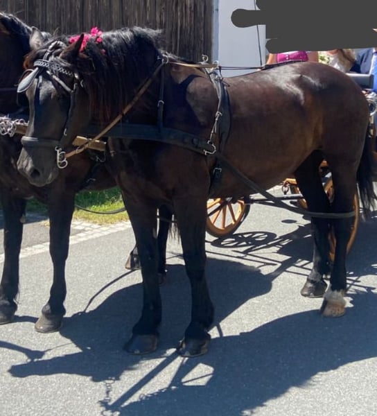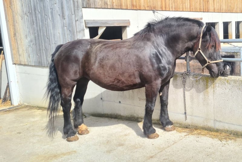 For sale: 12-year-old Noriker mare with a Rapp coat, no markings, born March 11, 2013. Regularly ridden, fearless and confident around people, machinery, tractors, trucks, dogs, and more. Very child-friendly as well. Children have previously ridden her, although she has never been fully backed or professionally trained. She has been regularly driven in a two-horse team with guests. Familiar with open stable and pasture management. She has not yet had a foal. Looking for a caring and loving home. Optional also available as a carriage horse.