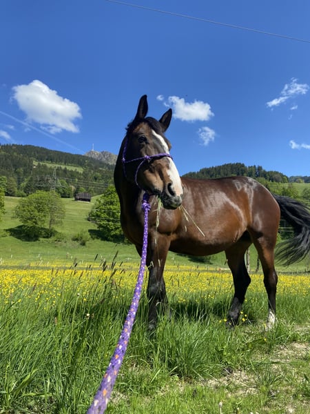 Maya, eine 15-jährige Noriker-Mix-Stute, ist auf der Suche nach einem neuen liebevollen Zuhause. Maya lernt sehr schnell und möchte stetig gefordert werden. Aufgrund beruflicher Veränderungen habe ich nicht mehr genügend Zeit, um Maya ihren Ansprüchen gerecht zu werden. Wir haben mit Maya regelmäßig Dressur und Springstunden genommen. Sie ist ein tolles Freizeitpferd, benötigt aber die Sicherheit ihres Reiters. Reiten in der Halle oder auf dem Platz ist für sie überhaupt kein Problem. Beim Ausreiten (alleine) kommt es ehrlich gesagt auf den Reiter an. Ausreiten mit anderen Pferden ist überhaupt kein Problem. Gruppenreitstunden haben auch immer einwandfrei funktioniert. Sie benötigt einen erfahrenen, selbstbewussten Reiter, für Anfänger ist sie weniger geeignet.