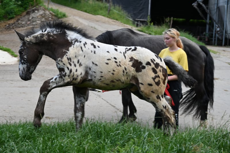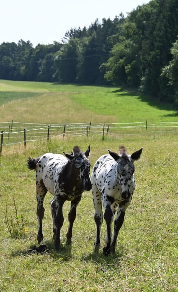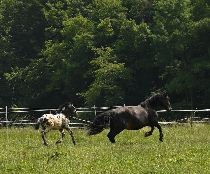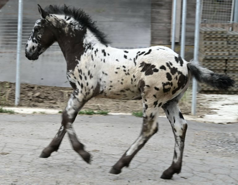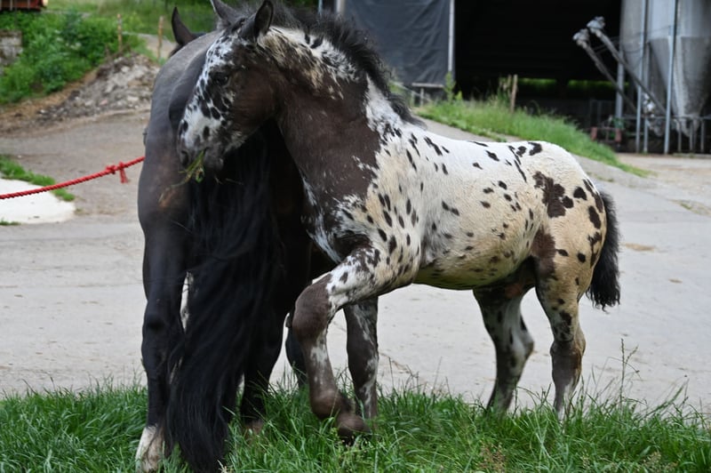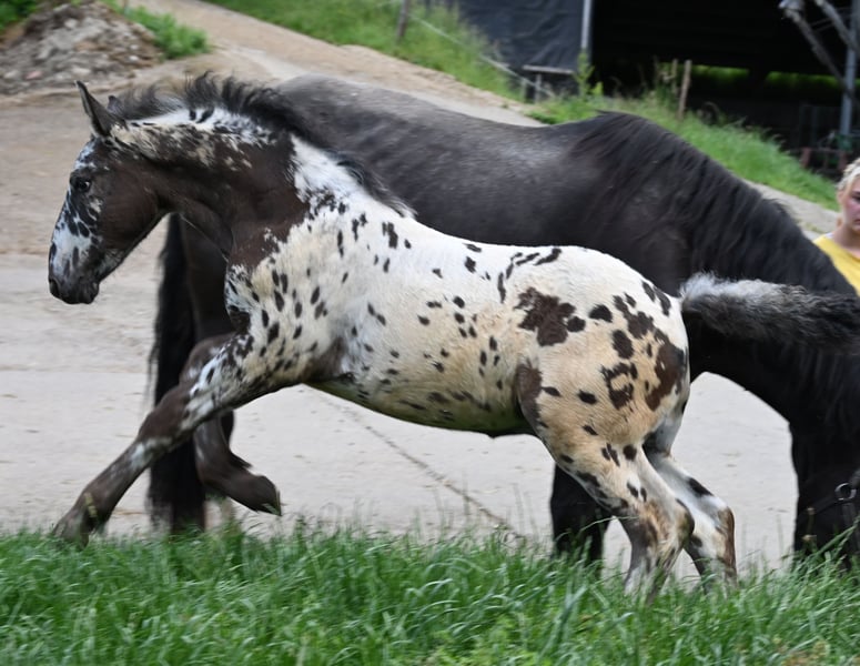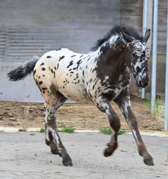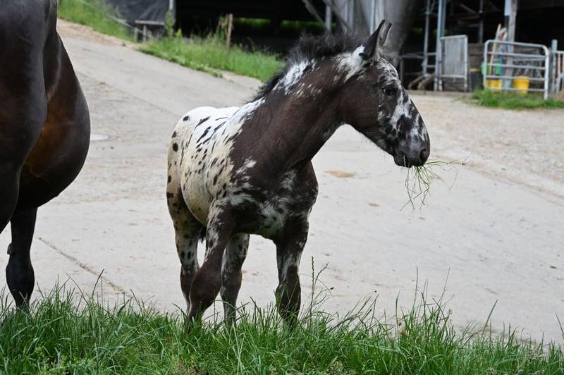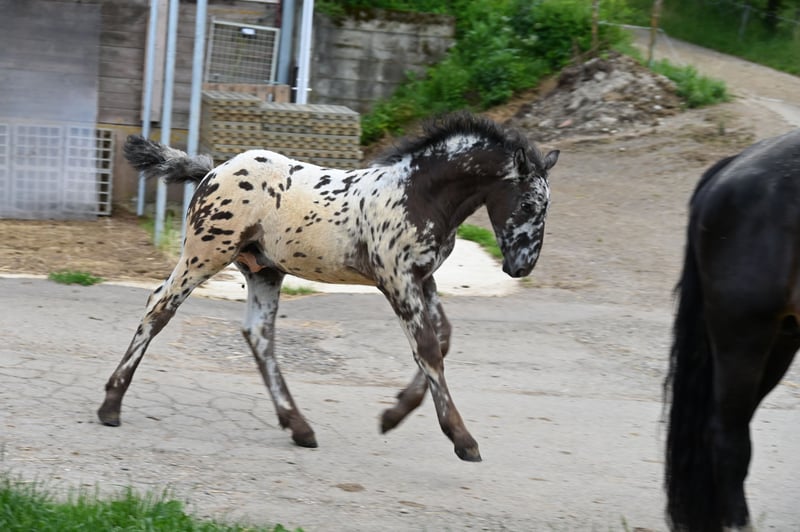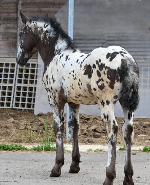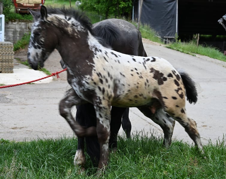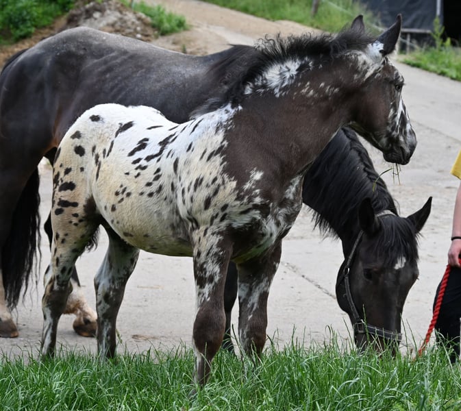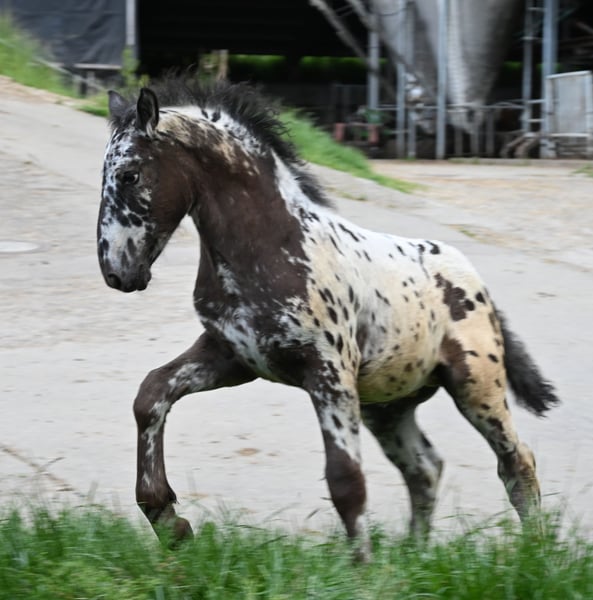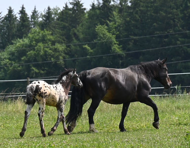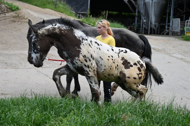 Freckle Elmar Kubny is a very successful Noriker black-spotted stallion foal. He brings high quality, making him interesting as a candidate for licensing. But he also has all doors open as a leisure horse. His mother is a state premium mare, who was entered into the studbook with a score of 8/1b, and was the reserve champion at the national show in Stadl-Paura, as well as the winner of the performance test with a score of 9.13 and no score below 9, a very correct and performance-ready mare with a lovable character. The entire pedigree of Savrin-Lisa is outstanding, and she has passed this on to her son. Freckle means "freckle," and he is expected to grow to about 161-164 cm. He will be sold with a well-fitting foal ABC. He is used to farm machinery, farm animals, and children. Freckle was born on March 24, 2025, and will stay with his mother until the end of September. He will be dewormed multiple times and tested free of PSSM1. Sire: Fantastik Elmar, Dam's Sire: Gilbert Diamant