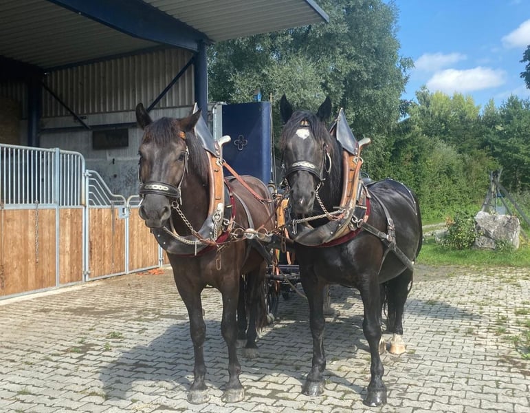 Jack Vulkan is a 3.5-year-old Noriker cross. His sire was a Noriker from the Vulkan line, and his dam is a Noriker x Friesian cross. Jack is a black gelding with no markings. He is very affectionate and friendly, both with other horses and with people. It’s clear that he has received a good upbringing from the start. Jack stands approximately 157 cm (16.1 hh) and is still growing. He has been driven in pairs, triples, and quadruples. In the arena and on the trails, he has been ridden in all three gaits, and he is always motivated and eager to do his best. As a foal, he already pulled a cart with his mother, which helped him learn a lot. He is well acquainted with other farm animals, machinery, and children. Jack is very calm and obedient when loading into the horse trailer and is well-behaved at the farrier. He is barefoot and has been regularly dewormed.