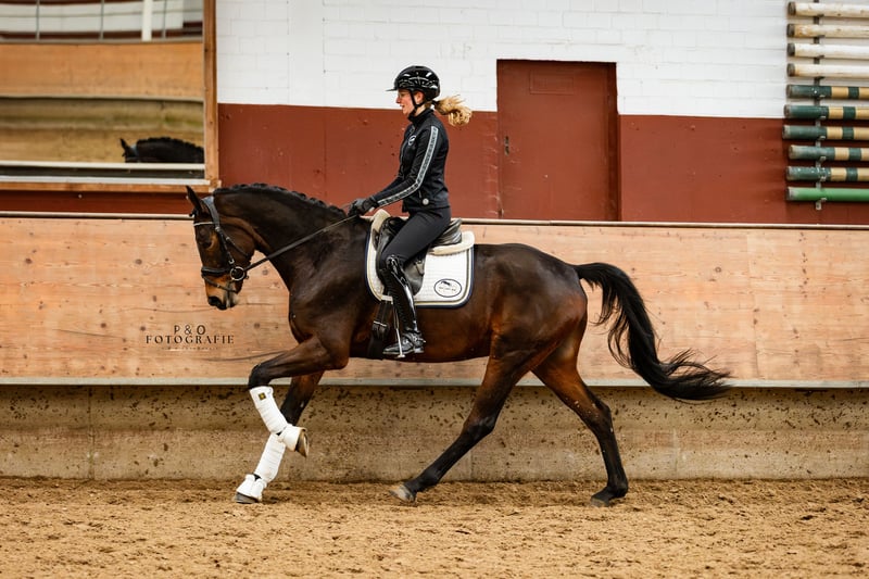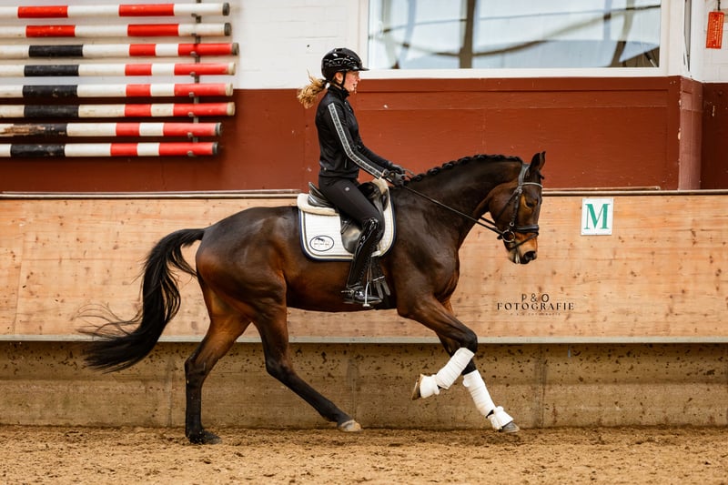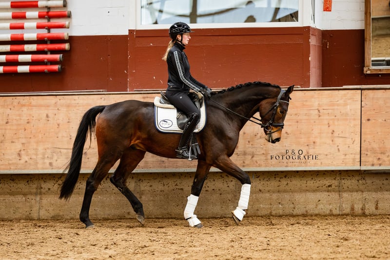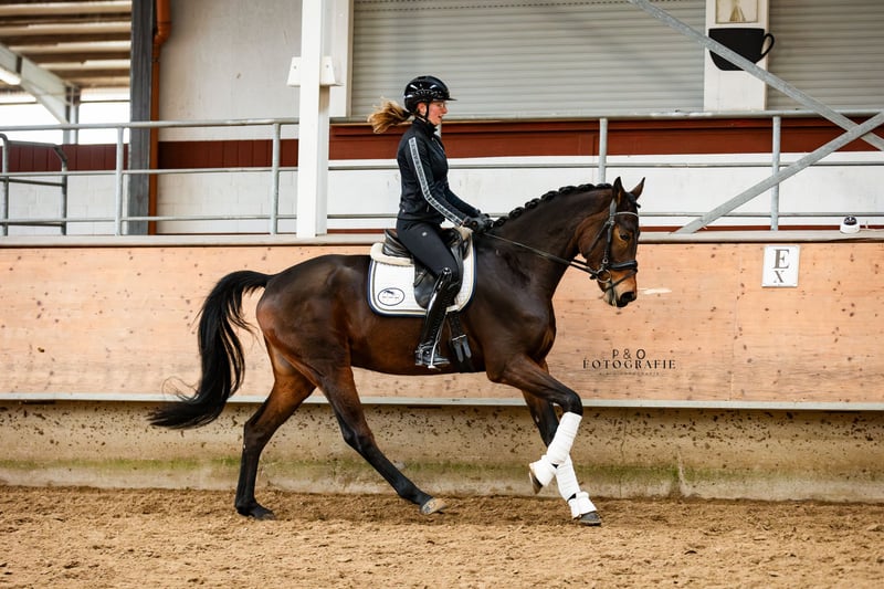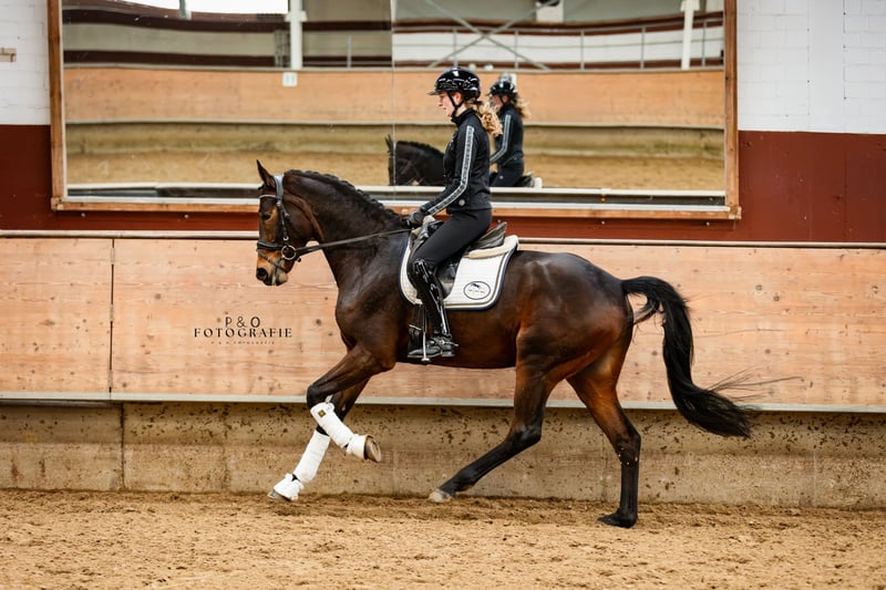 Great horse for the ambitious competition or leisure rider. Sanox impresses with his great character and attitude. He has good basic gaits, with the canter being particularly noteworthy, and is a pleasure to ride. Sanox is very well-behaved but still has a very pleasant 'go' and a very active hind leg, which makes working with him very easy. Whether outdoors or indoors, he always does his job. With Sanox, you get a quality, uncomplicated, and easy-to-ride young horse at the best age. Due to his size and character, he is certainly also very interesting for riders transitioning to a new horse. Sanox also jumps well, has an outstanding canter, is very brave, and is not at all spooky, making him a candidate for eventing as well (his full brother is very successful in eventing). With further training, all doors are open for Sanox.