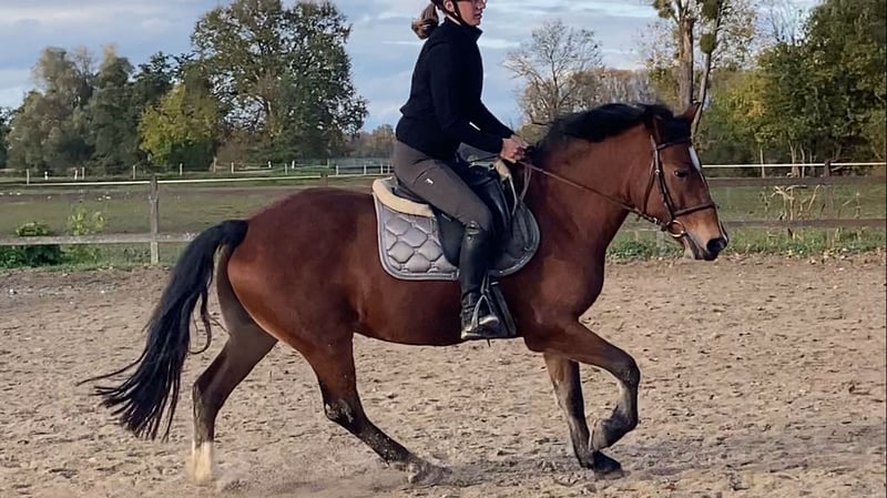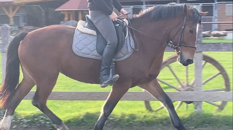 Zum Verkauf steht eine 9-jährige Endmaßponystute, ca. 145cm groß und absolut nervenstark und unerschrocken. Sie besticht durch ihren tollen und sehr braven Charakter sowohl im Umgang als auch unter dem Sattel. Auch im Gelände ist sie eine echte Lebensversicherung, jederzeit kontrollierbar, auch in der Gruppe und überhaupt nicht schreckhaft. Sie kennt Kinder, Hunde sowie sämtliche Maschinen und ist freundlich zu Artgenossen, total verschmust sowie schmiede- und verladefromm. Ein bombensicherer Allrounder für Dressur, Springen und Freizeit zum Sofort Losreiten und Spaß haben.