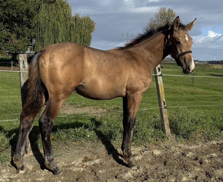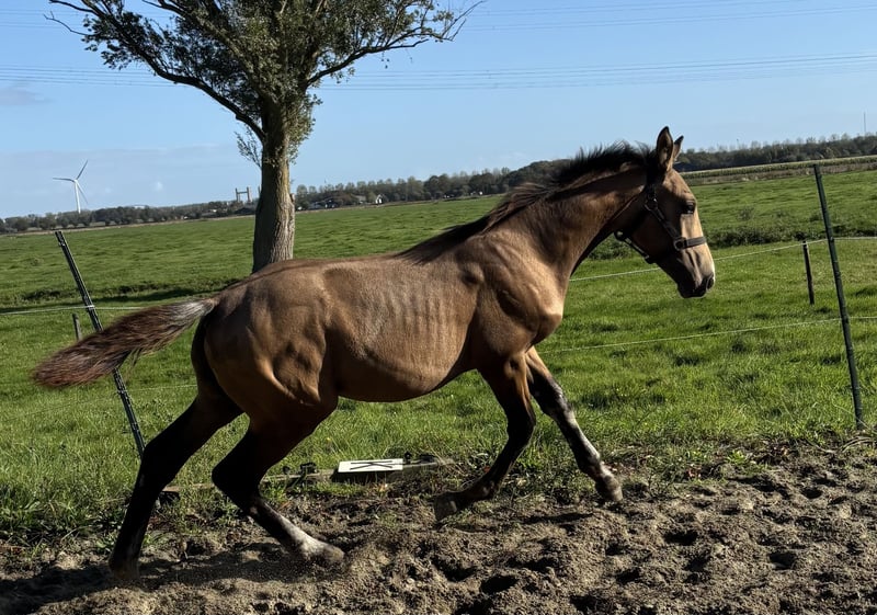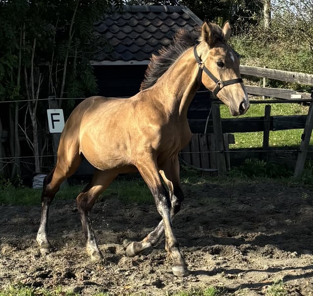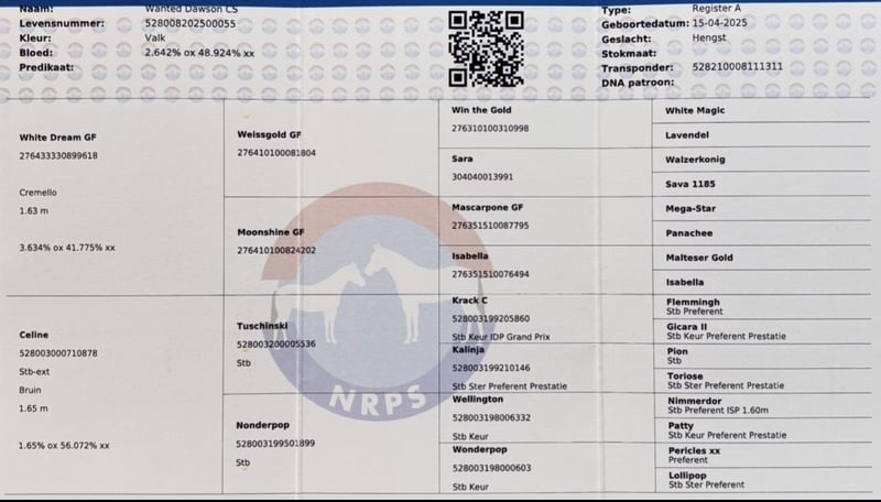 Dawson is een opvallend veulen hij is op 15 april geboren. Een rustige veulen. Hij kan voor veel ingezet worden o.a , springen of dressuur en ook eventing etc etc. Dawson zal rond de 1.70/1.80 worden. Hij heeft ook nog is een leuk interessante bloedlijn , wie droomt hier nou niet van! Hij is erg sociaal en nieuwsgierig. wie wilt deze opvallende knapperd zien opgroeien , en in het toekomst aan het werk zetten? *100% geen incest. *Moeder en vader WFFS negatief. * moeder en vader PSSM1 negatief. Pluspunten: • 1e premie behaald op de regionale NRPS keuring ( mooie beoordelingen) • recent afgespeend op een rustige mooie manier word dit gedaan ( staat nog naast mama in paddock en stal) stap voor stap. ✔️ NRPS paspoort en stamboom ✔️ Dekbewijs-certificaat ✔️ Koopovereenkomst ✔️ Wormenkuren netjes bijgehouden Afstamming : moeder kwpn Tuschinski x Krack C x Wellington x kalinja (ster) x lollipop (ster) x toriose (ster). Nog nooit zo’n lieve eerlijke kwpn merrie meegemaakt , ze is werkwillig, slim, gevoelig, ze heeft een lief zacht eerlijk karakter. Nuchter buiten met verkeer. Vader White Dream GF ras zuivere Duits gefokte Oldenburg Mascarpone x Weissgold gf x win the gold. hengst uit bewezen Duitse bloedlijnen (Holsteiner en Trakhener) en staat bekend om zijn fijne nuchtere karakter. Zijn afstamming zorgt voor allround sportgenen en kwaliteit. Zijn nakomelingen gooide in 2022 tot hede hoge ogen tijdens keuringen, uit zowel spring- allround merries als uit dressuur gefokte merries. Interesse? Dawson is klaar om iemand z’n droompaard te worden. Hij is op het moment afgespeend kan opgehaald worden bij alleen een juiste huis! Neem contact op voor meer info of een bezichtiging. Locatie: zwartewaal Zuid-Holland