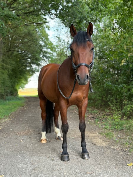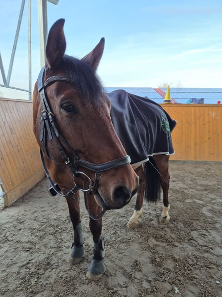 I am selling my 10-year-old gelding Rocketman. He measures approximately 1.55 meters at the withers, has a sturdy build, making him suitable for larger riders as well. Rocky is a very affectionate and cuddly horse. He is kept in a box with daily turnout to paddock or pasture, which I consider very important for his future home. He is very social with other horses and enjoys playing. In handling (grooming, tacking up, bridling), he is completely uncomplicated. Since I have no ambitions for competition, he has only been ridden recreationally over the past four years. His previous owners introduced him to rider competitions. He is trained up to A-level dressage and still has potential for further development with additional training. I have also participated in clinics for pole work. My riding partner has jumped him, which he thoroughly enjoys. He makes good jumps but needs a rider who can give him confidence and help him with proper distances. He is used to hacking alone and in groups. He adapts well to different riders but is not suitable for a riding school or dealer sale!! He is suitable for experienced adults and teenagers, but not a beginner’s horse. Rocky has been regularly dewormed and vaccinated. His teeth are checked every six months (no treatment needed), and he has received regular osteopathic/physiotherapeutic treatments. The saddles have also been regularly checked and adjusted. He is shod in front. During the summer, he is sensitive to flies around the head when riding, so I usually ride him outside with a nose net and fly mask. He is absolutely trailer-safe and stands calmly on the trailer. Price includes complete equipment, including a dressage saddle from Stübben and a jumping saddle from Passier.
