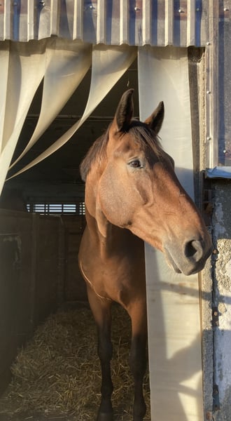 We are looking for a loving home for Scampi where he can feel comfortable. He is very friendly and currently shares his daytime turnout with five other geldings.