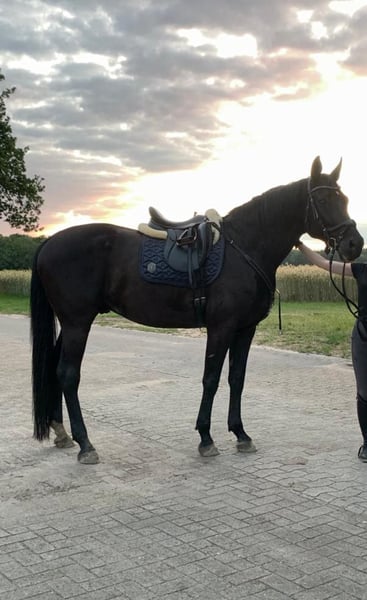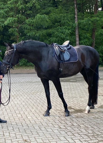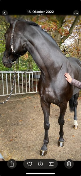 We are looking to place our beautiful Oldenburg gelding, 11 years old with a height of approximately 17.5 hh, into caring hands, as we can no longer give him the time he deserves. He masters all basic gaits under saddle and on the longe line. He is familiar with side reins and is well-behaved in handling. Simply is a licensed stallion, gelded at age 8 (showing no stallion behaviors). He is trained and presented up to M-level dressage. He has won Dressurpferde L, but we have not competed with him further. He is regularly vaccinated, dewormed, and seen by the dentist and farrier (currently unshod). He handles all procedures calmly. Simply has two cysts, which, according to the veterinarian, do not impair him (X-ray images can be provided). An ultrasound in 2023 showed no additional abnormalities. For this reason, we do not wish for him to be used in competitive riding (dressage, jumping, or vaulting). We are seeking an experienced and sensitive owner and wish for him to find a loving, permanent home with herd companionship and plenty of turnout. At night, he stays in a box stall with us; in summer, he is on pasture 24/7. He gets along well with other horses. If you can imagine giving him a home or have further questions, we look forward to hearing from you. Sale only to private individuals (no dealers, no riding schools, etc.) with a sales contract. Accessories can be purchased separately.