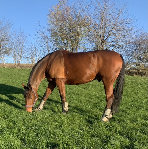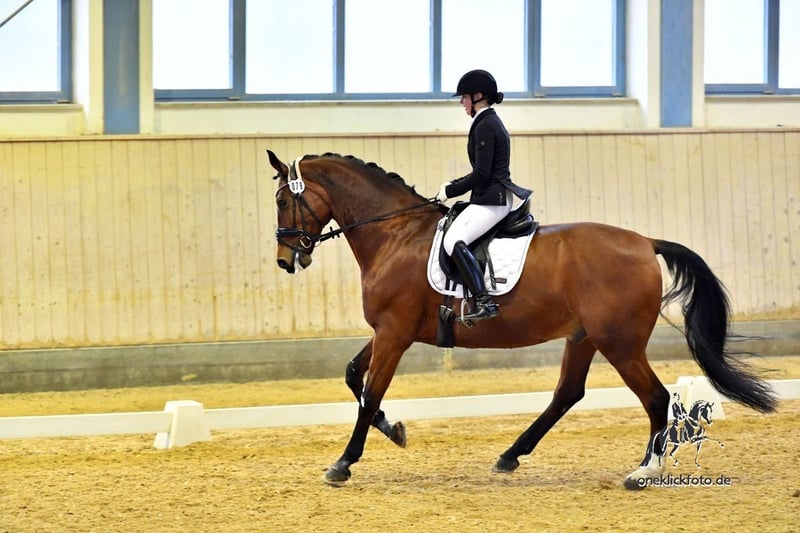 An impressive Oldenburg gelding is for sale. This handsome bay impresses with a height of 178 cm and is a real eye-catcher. He is always decent when ridden, can be relied upon to go out alone or in a group, and also enjoys jumping a small course (also with a dressage rider). His dressage training level is M-ready (unfortunately the videos are a little older). With his excellent training and elegant appearance, he is the ideal partner for any ambitious rider. Due to his pedigree-appropriate - always adjustable - go, he is also ideal for an eventing rider. He is well-behaved and knows his way around a horse walker, paddock and paddock. If you are looking for a talented and experienced riding horse that is convincing both in the arena and in everyday handling, then he could be just the right horse for you. Here is a youtube link: https://www.youtube.com/watch?v=mZDy4KLL4hg For further information and to arrange a viewing appointment, please contact us.