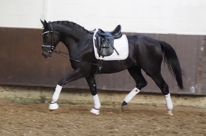 Dieser schicke lackschwarze und ausgesprochen bewegungsstarke fast 3 jährige Cafe au lait Nachkomme überzeugt auf ganzer Linie durch Qualität, Aussehen und Pedigree! Ebenso zeigt er sich beim Freispringen ausgesprochen talentiert mit viel Vermögen und Vorsicht! Da früh geboren und weit entwickelt ist er ist bereits gut longiert und an Reitergewicht gewöhnt. Stckm. zur Zeit ca. 1,69m, Endmaß um die 1,72m. Mutter selbst ist ebenfalls enorm ausdrucks- und bewegungsstark, war Elietauktionsfohlen und stammt aus einer Staatsprämienstute mit überragender SLP. Der Vater Cafe au lait, Siegerhengst seiner Körung, HLP Sieger und BuCha Finalist, war selbst siegreich in der schweren Klassen und hat sich in den letzten Jahren einen Namen als Doppelvererber mit Spitzennachzucht gemacht. So wurde Cafe's Casimir" (Cafe au lait x Calido x Grannus) gefeierte Preisspitze der Oldenburger Eliteauktion, ist bereits in jungen Jahren Seriensieger in S- Dressuren und international Intermediaire I siegreich. Stute Kasselmanns Cafe's Caletta (Cafe au lait x Calato) ist ebenfalls bereits S-Dressur platziert und international Grand Prix siegreich. Cafe's Matts (Cafe au lait x Don Frederico) wurde zweitteuerstes Dressurpferd der Oldenburger Summer Mixed Sales. Weitere Jungpferde aus springbetonten Mutterstuten sind bereits mehrfach in Dressurpferdeprüfungen A bis M platziert und sind bemerkenswert bewegungsstark und kopfklar. Dass die Cafe au lait Nachkommen im Springsport bis zur schweren Klasse überzeugen steht außer Frage, so zum Beispiel aus unserer Zucht: Cafe's Champus: gekört, Vizeweltmeister der jungen Pferde Cafe Junior: gekört, international erfolgreich in Saudi Arabien Cafe's Columbo: gekört und sporterfolgreich in Frankreich Cafe's Don Rubin: gekört, 4jährig als jüngstes Pferd Bronze beim Dobrocker Deisterchampionat, aktuell qualifiziert zum Bundeschampionat in seiner 2. Springpferde-M! Cafe`s Deconi: gekört, grade 3jährig 50 Tage Leistungsprüfung mit Noten bis 9,0 abgelegt! Stationiert bei Paul Schockemöhle zeugte Cafe au lait schon etliche international erfolgreiche Springpferde, u.a. "Royce", siegreich im FEI CSI5* $500,000 Rolex Grand Prix Wellington. Cafe au lait selbst war unter Philipp Weishaupt Bundeschampionatsfinalist und ist bis S*** Springen erfolgreich gewesen, ist aber auch mit drei spektakulären GGA ausgestattet und dressurmäßig auf S Niveau ausgebildet worden. Unsere Fohlen bekommen täglich Mineralfutter und Fohlenstarter, regelmäßig EQUISTRO Haemolytan und Ipaligo Foal, Wurmkuren und Schmied sind natürlich ebenfalls selbstverständlich. Auch die Muttertiere bekommen die ganze Trächtigkeit hindurch spezielles Stutenfutter, täglich Saftfutter und Leinöl, sowie Heu ad libitum. So ist unsere Nachzucht stets im besten Gesundheitszustand und top im Lack! Weitere Fohlen und Nachwuchspferde aus eigener Zucht auf Anfrage. Ein Teil ist auch unter den anderen Anzeigen zu finden. Es stehen auch immer wieder einige tragende Zuchtstuten zum Verkauf. Anfragen nach Videos etc. ausschließlich vorab via WhatsApp möglich. Cafe`s Fernando verfügt bereits über aktuelle sehr gute Röntgenbilder.
