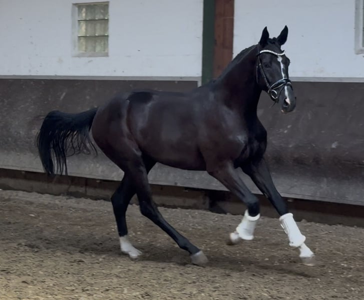 Dieser schicke lackschwarze und ausgesprochen bewegungsstarke fast 3 jährige Cafe au lait Nachkomme überzeugt auf ganzer Linie durch Qualität, Aussehen und Pedigree! Mutter selbst ist ebenfalls enorm ausdrucks- und bewegungsstark, war Elietauktionsfohlen und stammt aus einer Staatsprämienstute mit überragender SLP. Der Vater Cafe au lait, Siegerhengst seiner Körung, HLP Sieger und BuCha Finalist, war selbst siegreich in der schweren Klassen und hat sich in den letzten Jahren einen Namen als Doppelvererber mit Spitzennachzucht gemacht. So wurde Cafe's Casimir" (Cafe au lait x Calido x Grannus) gefeierte Preisspitze der Oldenburger Eliteauktion, ist bereits in jungen Jahren Seriensieger in S- Dressuren und international Intermediaire I siegreich. Stute Kasselmanns Cafe's Caletta (Cafe au lait x Calato) ist ebenfalls bereits S-Dressur platziert und international Grand Prix siegreich. Cafe's Matts (Cafe au lait x Don Frederico) wurde zweitteuerstes Dressurpferd der Oldenburger Summer Mixed Sales. Weitere Jungpferde aus springbetonten Mutterstuten sind bereits mehrfach in Dressurpferdeprüfungen A bis M platziert und sind bemerkenswert bewegungsstark und kopfklar. Dass die Cafe au lait Nachkommen im Springsport bis zur schweren Klasse überzeugen steht außer Frage, so zum Beispiel aus unserer Zucht: Cafe's Champus: gekört, Vizeweltmeister der jungen Pferde Cafe Junior: gekört, international erfolgreich in Saudi Arabien Cafe's Columbo: gekört und sporterfolgreich in Frankreich Cafe's Don Rubin: gekört, 4jährig als jüngstes Pferd Bronze beim Dobrocker Deisterchampionat, aktuell qualifiziert zum Bundeschampionat in seiner 2. Springpferde-M! Stationiert bei Paul Schockemöhle zeugte Cafe au lait schon etliche international erfolgreiche Springpferde, u.a. "Royce", siegreich im FEI CSI5* $500,000 Rolex Grand Prix Wellington. Cafe au lait selbst war unter Philipp Weishaupt Bundeschampionatsfinalist und ist bis S*** Springen erfolgreich gewesen, ist aber auch mit drei spektakulären GGA ausgestattet und dressurmäßig auf S Niveau ausgebildet worden. Unsere Fohlen bekommen täglich Mineralfutter und Fohlenstarter, regelmäßig EQUISTRO Haemolytan und Ipaligo Foal, Wurmkuren und Schmied sind natürlich ebenfalls selbstverständlich. Auch die Muttertiere bekommen die ganze Trächtigkeit hindurch spezielles Stutenfutter, täglich Saftfutter und Leinöl, sowie Heu ad libitum. So ist unsere Nachzucht stets im besten Gesundheitszustand und top im Lack! Weitere Fohlen und Nachwuchspferde aus eigener Zucht auf Anfrage. Ein Teil ist auch unter den anderen Anzeigen zu finden. Es stehen auch immer wieder einige tragende Zuchtstuten zum Verkauf. Anfragen nach Videos etc. ausschließlich vorab via WhatsApp möglich. Cafe`s Fernando verfügt bereits über aktuelle sehr gute Röntgenbilder. Da früh geboren und weit entwickelt ist er ist bereits gut longiert und an Reitergewicht gewöhnt.