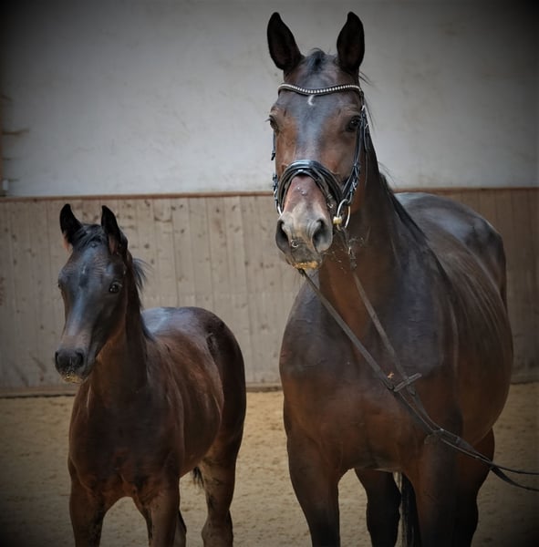 Bellissimo puledro stallone baio scuro con 4 calzini bianchi, nato a fine marzo 23 da For Romance x Desperados x Rohdiamant. È molto affettuoso e socievole con le persone. Diverse sorelle della madre hanno avuto un grande successo fino a Intermediaire I. La madre stessa, prima della riproduzione, ha vinto a 3 e 4 anni in prove di cavalli da sella e di dressage. La fattrice è in vendita anche per motivi di allevamento. È di nuovo gravida da For Romance. Video di un fratello maggiore: https://youtu.be/YlZ6QBI5hfk