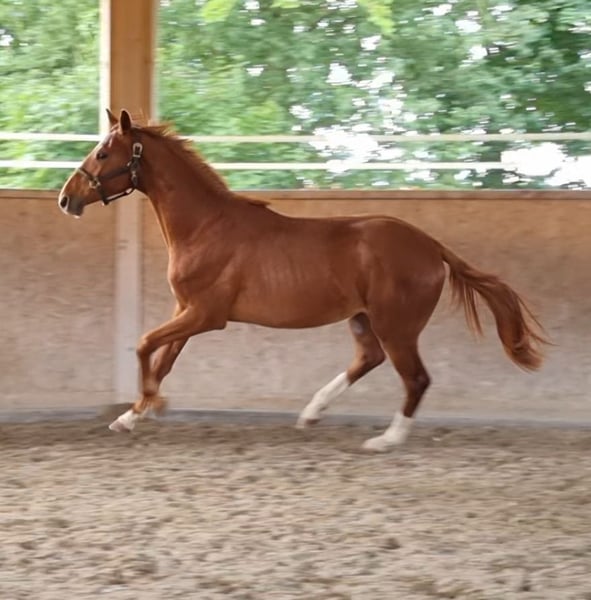 This handsome young man will soon be 2 years old and has a heart of gold. He was raised with me in the Hit Aktivstall in a mixed-age group of young horses. He was gelded at the end of January 25. Final height approximately 168-172cm. He is sure to become a great amateur horse as he is very people-oriented and has a wonderfully gentle temperament. He already loads well into the trailer and stands calmly during transport. He is also familiar with the horse walker. His sire is Escaneno, and his dam is by Depardieu. Pedigree see pictures. For sale due to downsizing to a loving home. Location near Karlsruhe - Southern Germany.