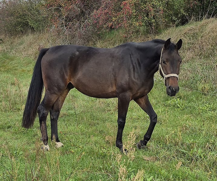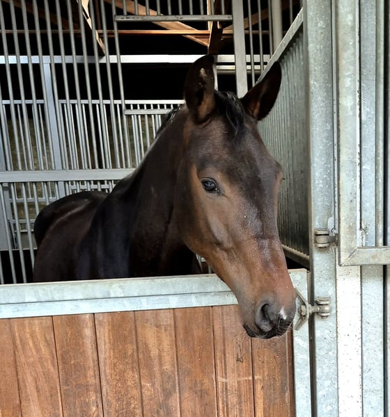 For sale is Bonegro, a beautiful Oldenburg gelding born in 2021. With his elegant dark brown coat and a height of 16.1 hh, he is a real eye-catcher. This talented gelding shows great potential in dressage and is ready to be further developed. He impresses not only with his relaxed basic gaits but is also very well-behaved, easy to ride, and has a high willingness to learn. He has already placed in dressage horse tests at the A level after a short time and is uncomplicated at competitions. He is suitable for both leisure and competition riding. From the direct maternal line, numerous horses have been successful in dressage at the M and S levels with amateur riders. If you are interested or need further information, please feel free to contact me. Video available via WhatsApp. Don't miss this opportunity to find a promising and reliable partner for the future!